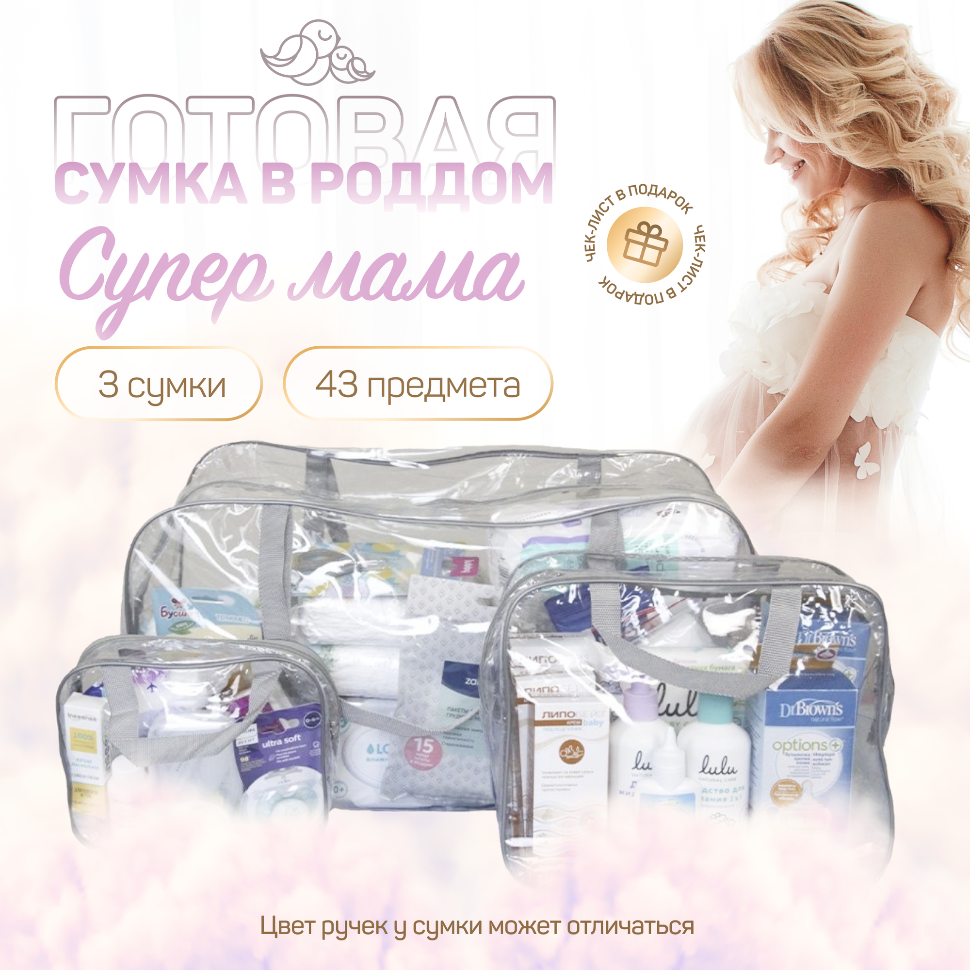 10 цен на Сумка в роддом готовая для мамы и малыша с наполнением, 43 предмета + 3 сумки, комплектация "Супер Мама", прозрачная