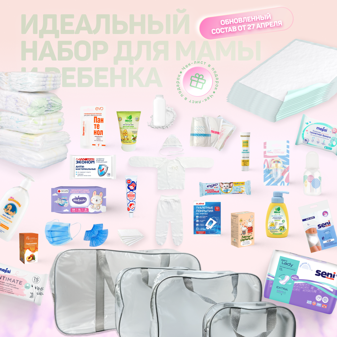 | Состав набора | бахилы, ватные диски, ватные палочки, влажная туалетная бумага, влажные салфетки, крем для сосков, одноразовые маски, одноразовые покрытия на сиденье унитаза, пеленки для мамы, пеленки для новорожденного, подгузники, прокладки для груди, прокладки послеродовые |