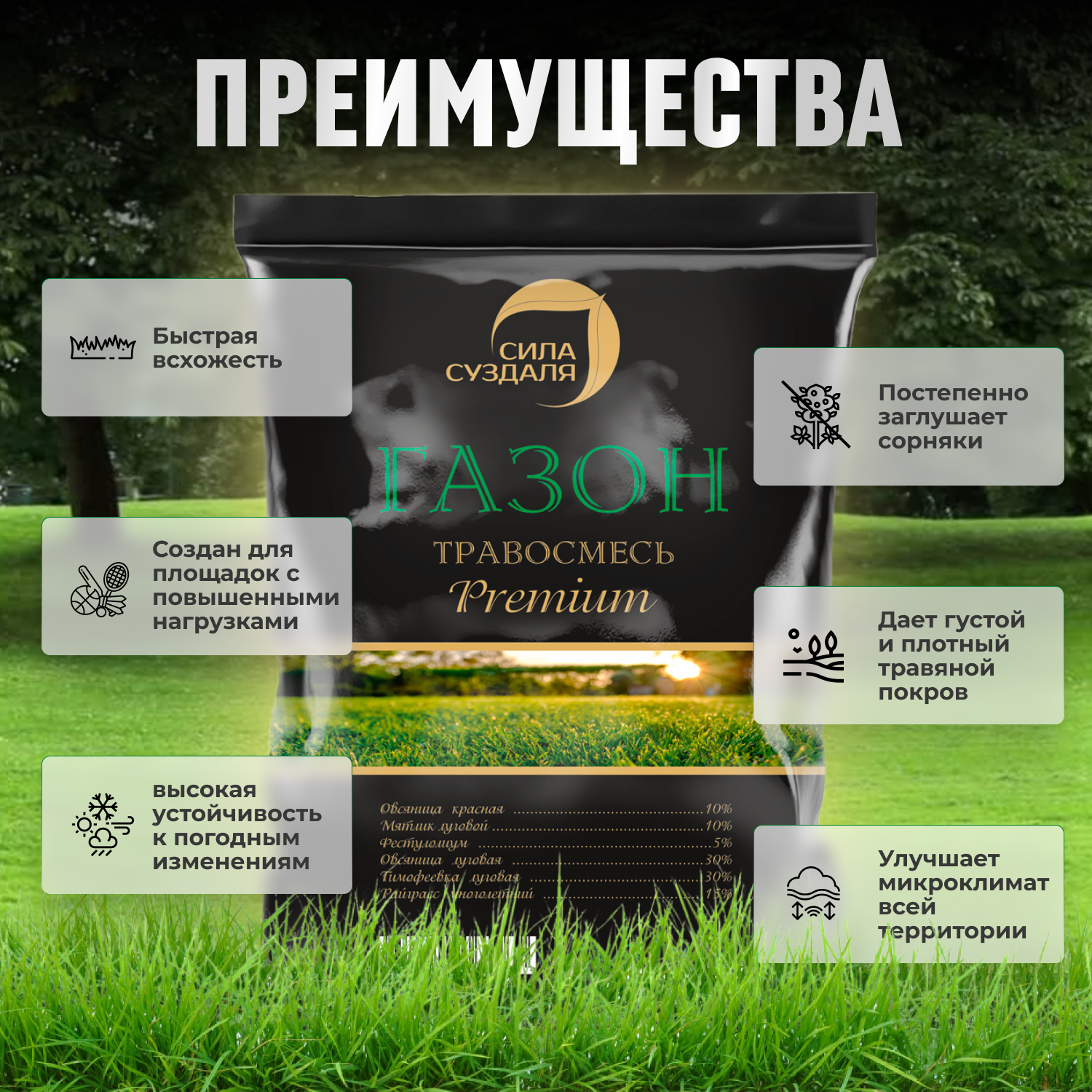 | Состав смеси | Овсяница красная 10%; Мятлик луговой 10%; Фестулолиум 5 %; Овсяница луговая 30%; Тимофеевка луговая 30%; Райграсс многолетний 15% |