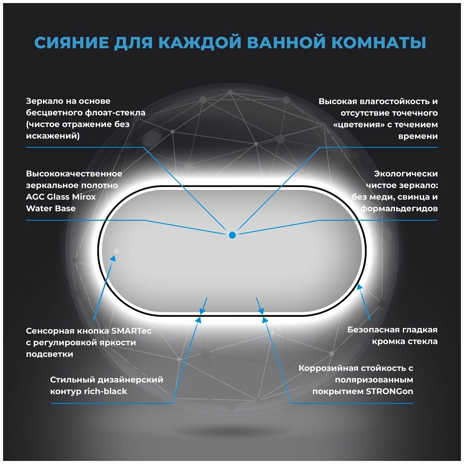 Настенное зеркало в ванную с подсветкой Wellsee 7 Rays' Spectrum 172201530 : влагостойкое овальное зеркало 90х50 см с черным матовым контуром