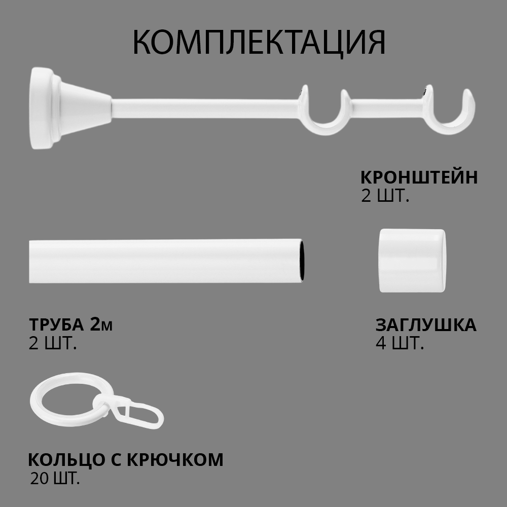 | Комплектация | труба для карниза 1,5м 4 шт, кронштейн для карниза 3 шт, наконечник для карниза заглушка 4 шт, соединитель для карниза 2 шт, кольца для штор с крючками 30 шт |