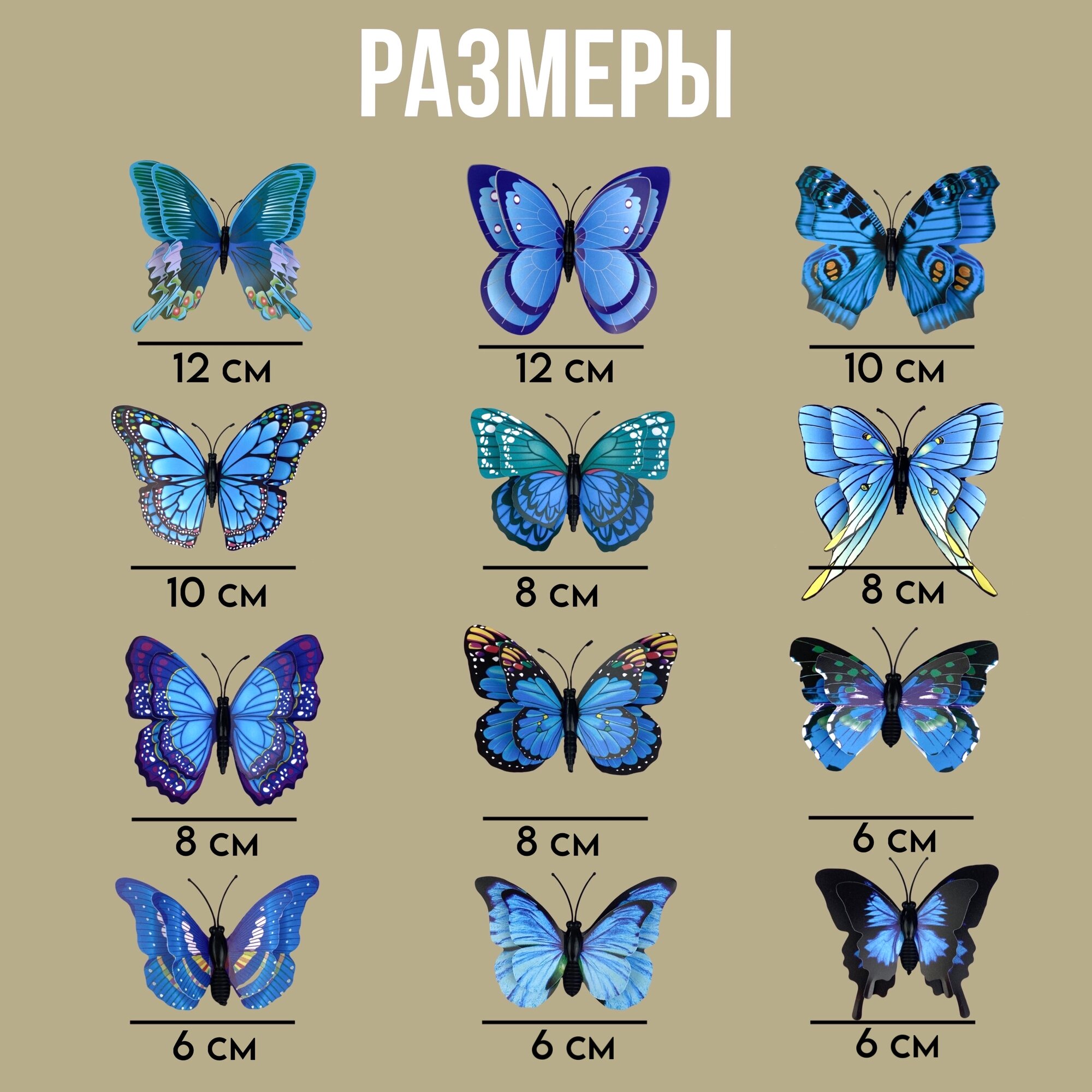 Наклейки интерьерные, декоративные бабочки 3D с магнитом на стену для декора, набор украшений на стену "Бабочки" синие информация: