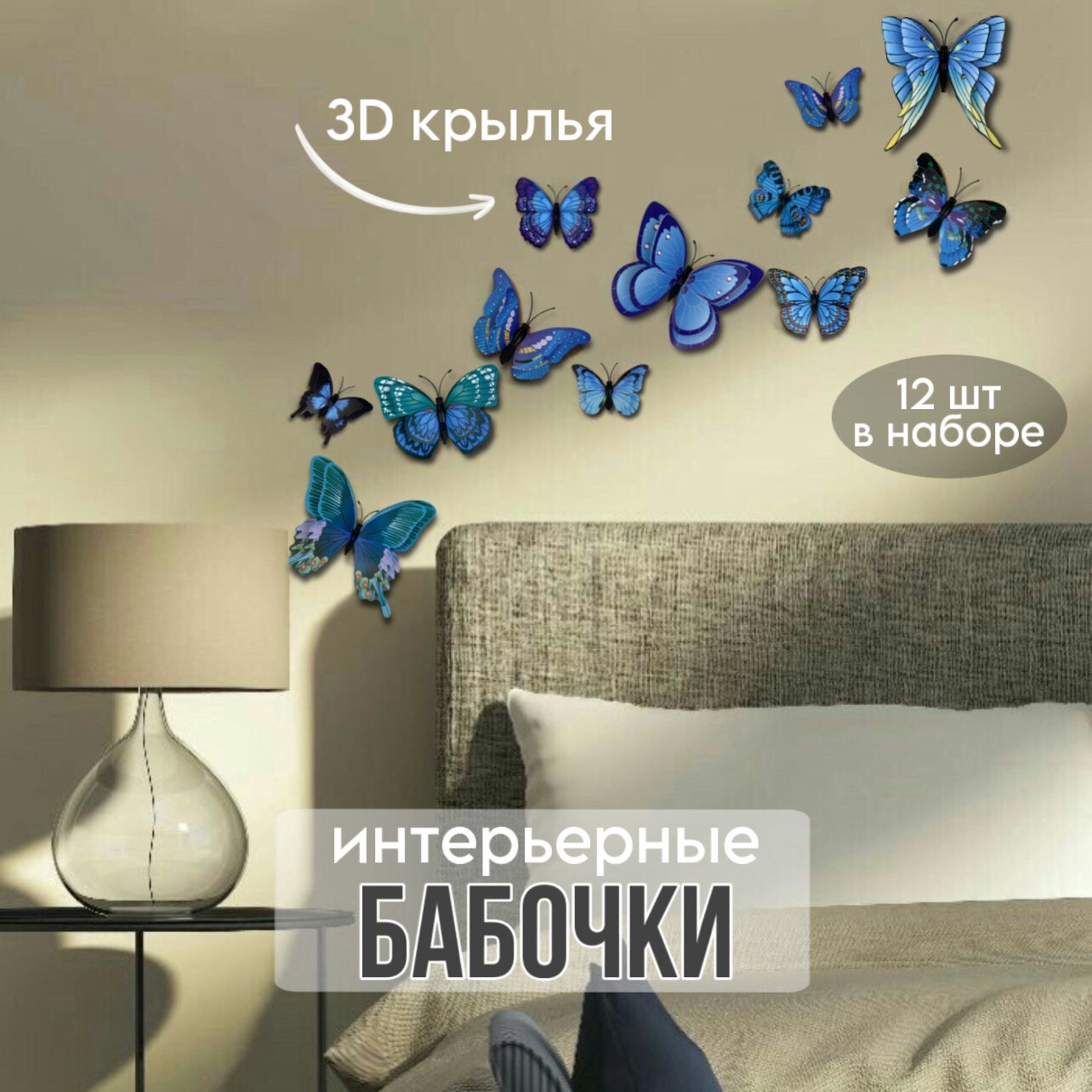 Отзывы на Наклейки интерьерные, декоративные бабочки 3D с магнитом на стену для декора, набор украшений на стену "Бабочки" синие