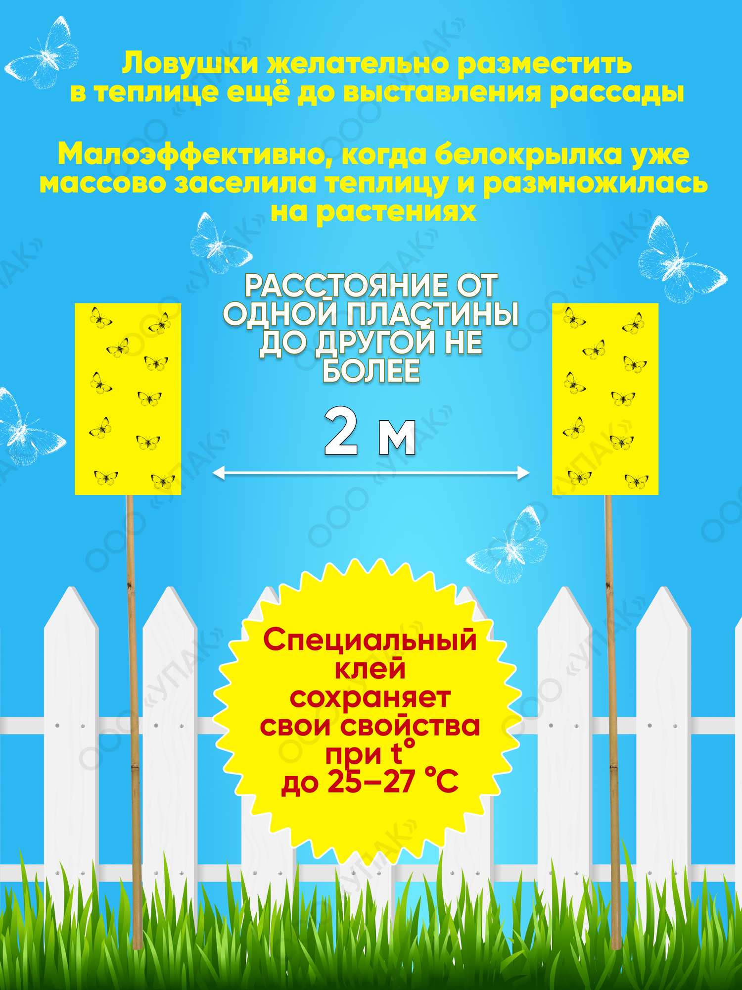 | Способ применения | Закрепите клеевую пластину с помощью проволоки, шпагата или другим способом, исключив её соприкосновение с растениями, и конструкцией теплицы, кроющим материалом. Аккуратно снимите с обоих сторон защитную бумагу, придерживая пластину, чтобы не надорвать. |