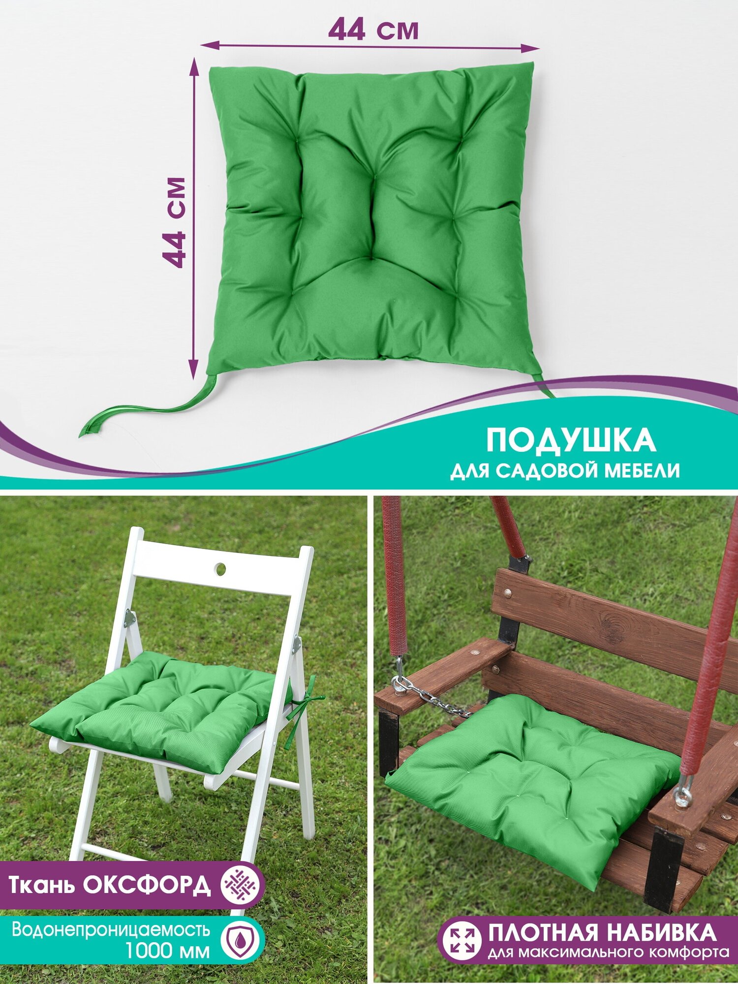 Подушка на стул и для садовой мебели,для качелей,на кресло,в баню ,водонепроницаемая 44x44 см зеленый,1шт