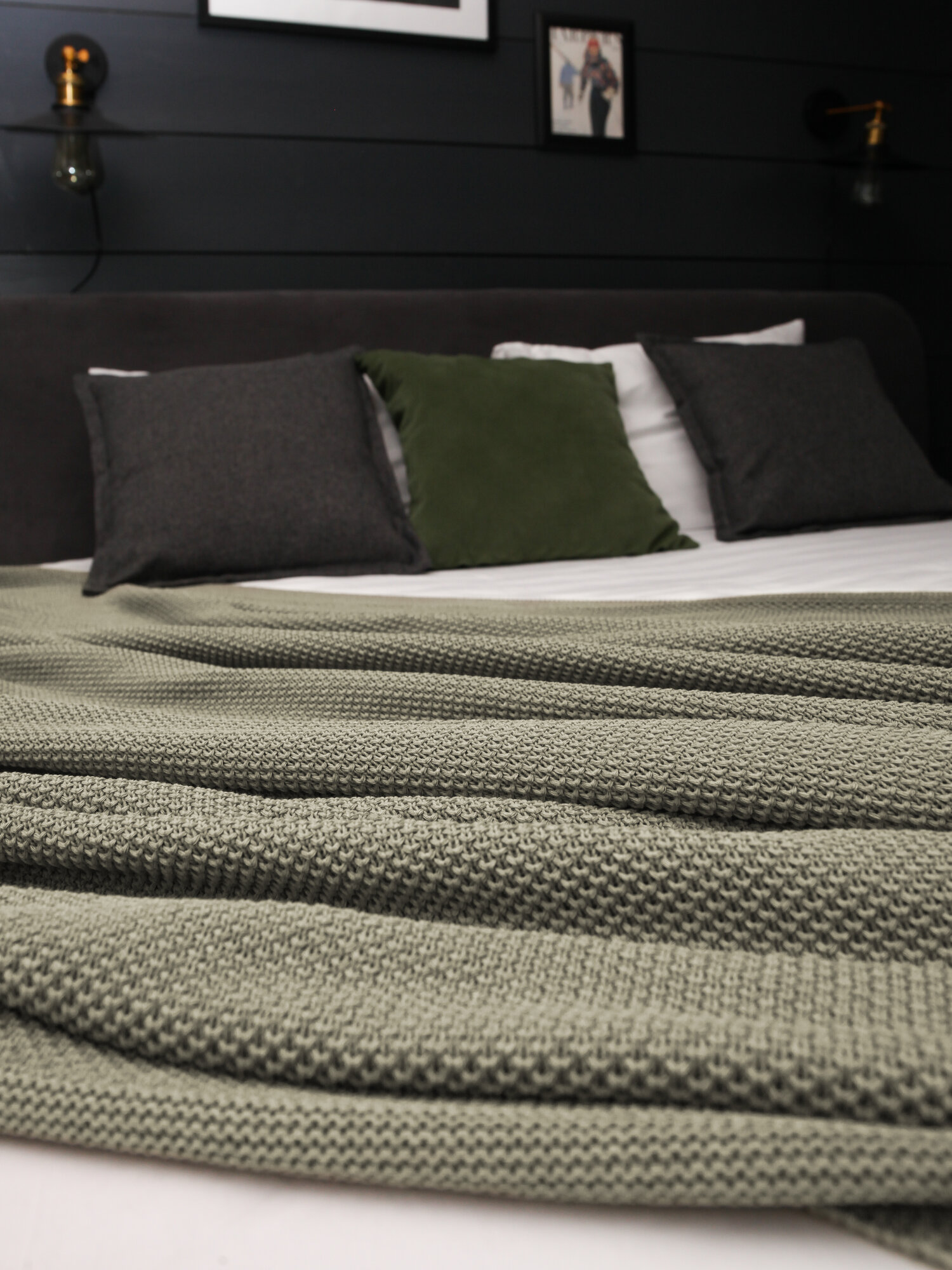 Отзывы на Плед 200х220, вязаный, KING PLAID, оливковый, хлопок 100%, покрывало на кровать, на диван, на кресло, большой, тонкий, в подарочной сумке