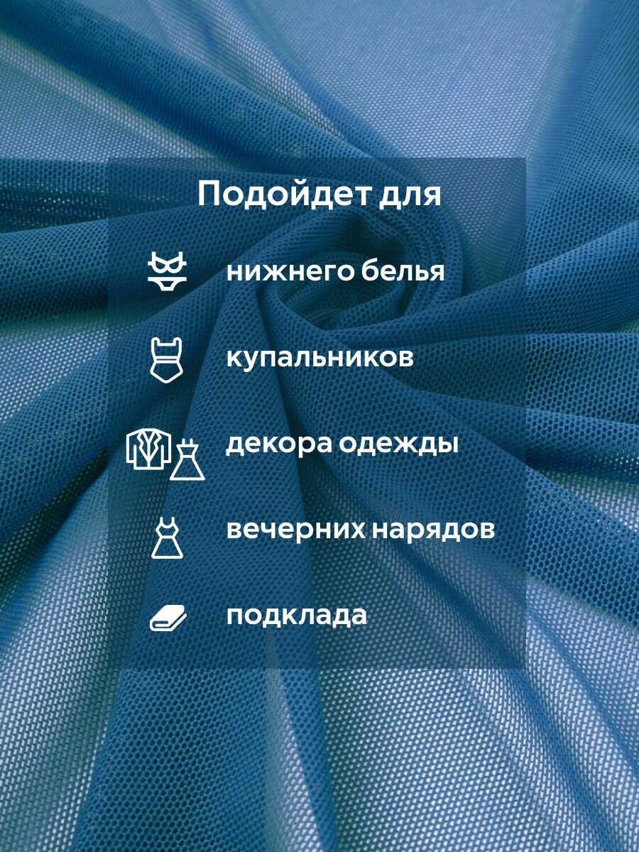 Сетка трикотажная эластичная стрейч Ткань для белья, купальников, одежды, подкладочная Темно-голубой Ширина - 155 см Длина - 1,5 метра Плотность - 90 г/м информация: