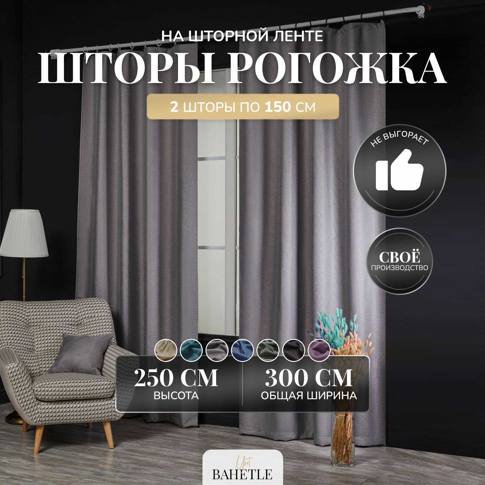 Комплект штор Bahetle из Рогожки 150х250 см 2 шт на ленте, готовые однотонные портьеры димаут от солнца для спальни, детской, дачи, гостиной серые информация: