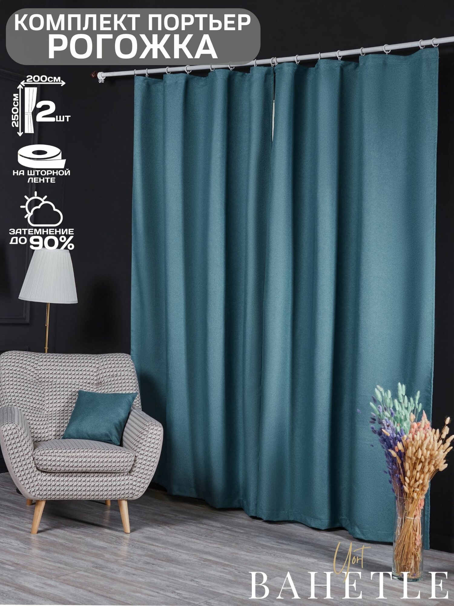 Комплект штор Bahetle из Рогожки 200х250 см 2 шт на ленте, готовые однотонные портьеры димаут от солнца для спальни, детской, дачи, гостиной синие 2 740 ₽