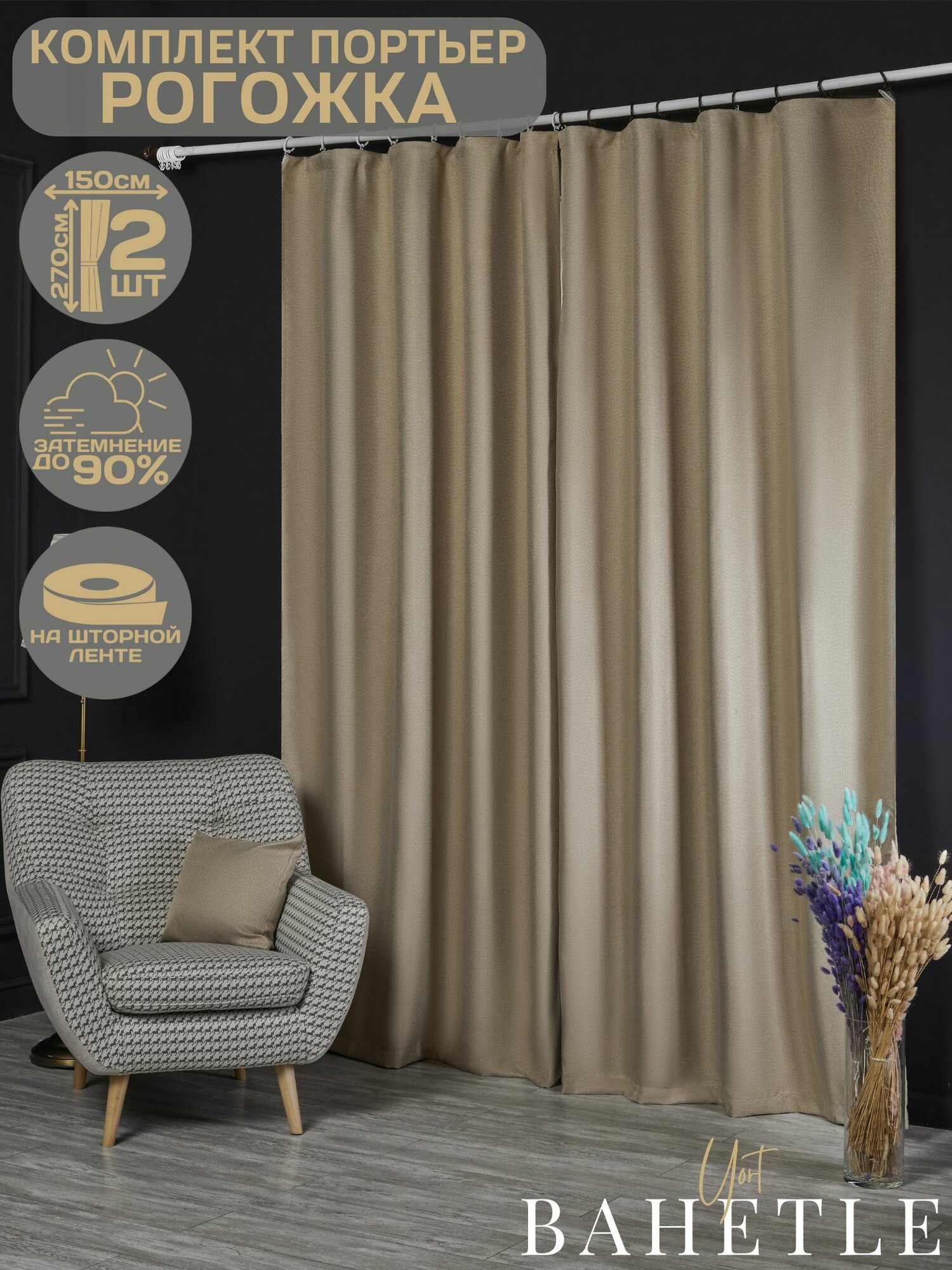 Комплект штор Bahetle из Рогожки 150х250 см 2 шт на ленте, готовые однотонные портьеры димаут от солнца для спальни, детской, дачи, гостиной бежевые 3 351 ₽