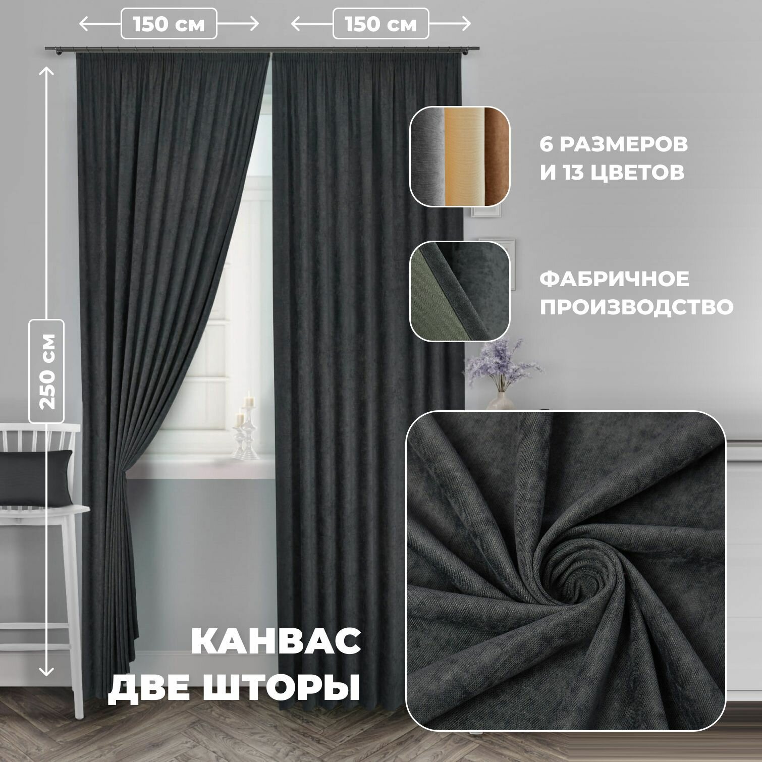 Комплект штор для комнаты Канвас Shtoraland на ленте для крючков, две портьеры для гостиной, спальни, детской. Общий размер 500x250 см, темно-серый 4 290 ₽