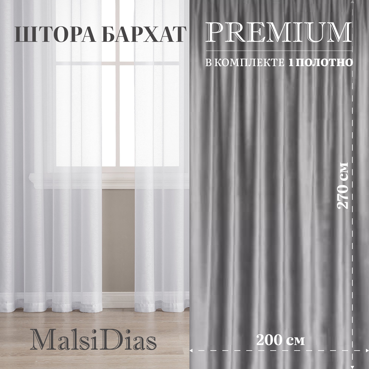 Отзывы на Штора бархат MalsiDias 270х200, светло-серый. Портьера на шторной ленте. Шторы для комнаты, гостиной, кухни.