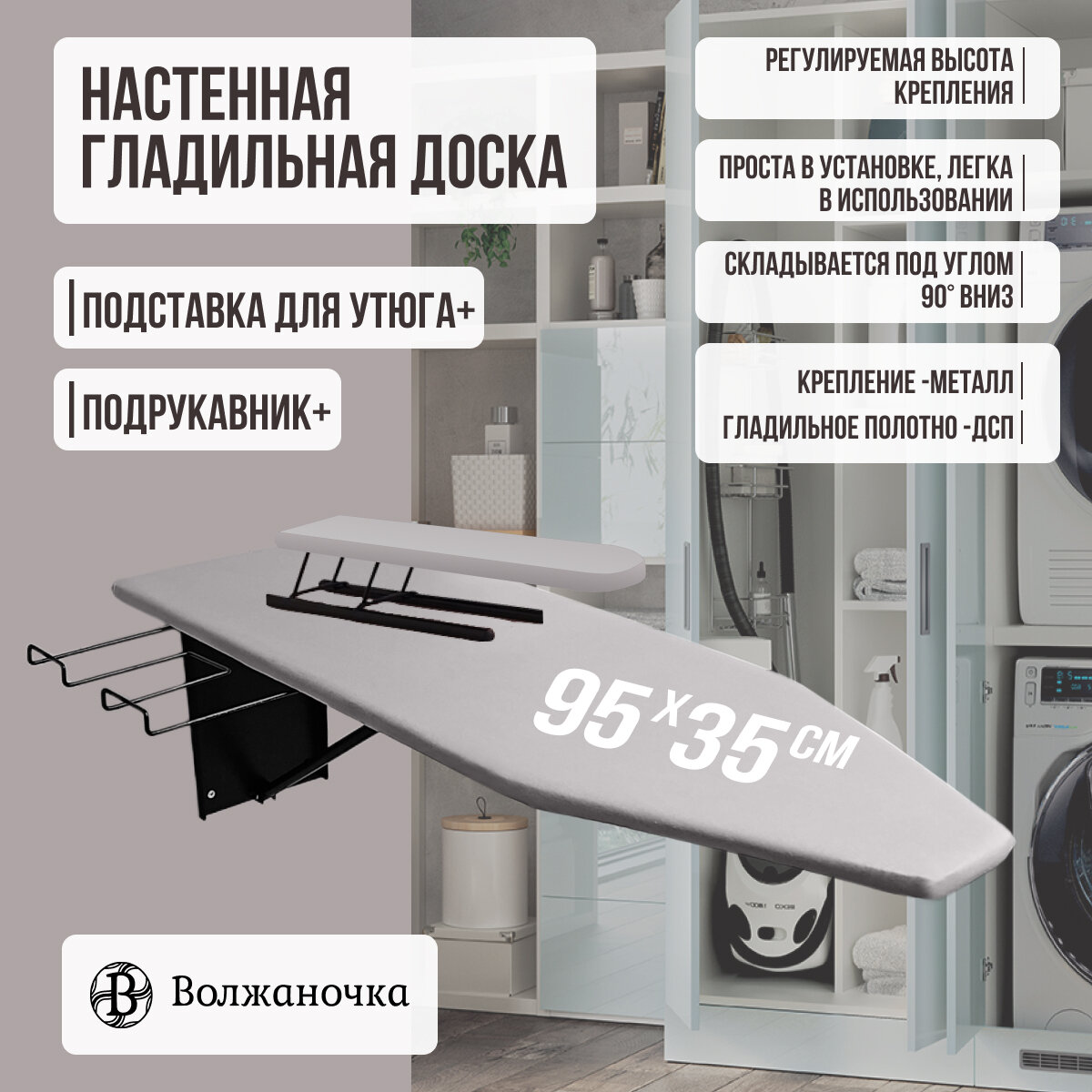 Отзывы на Волжаночка Гладильная доска настенная с подрукавником, подставкой для утюга, размер 95х35см., цвет серый кварц