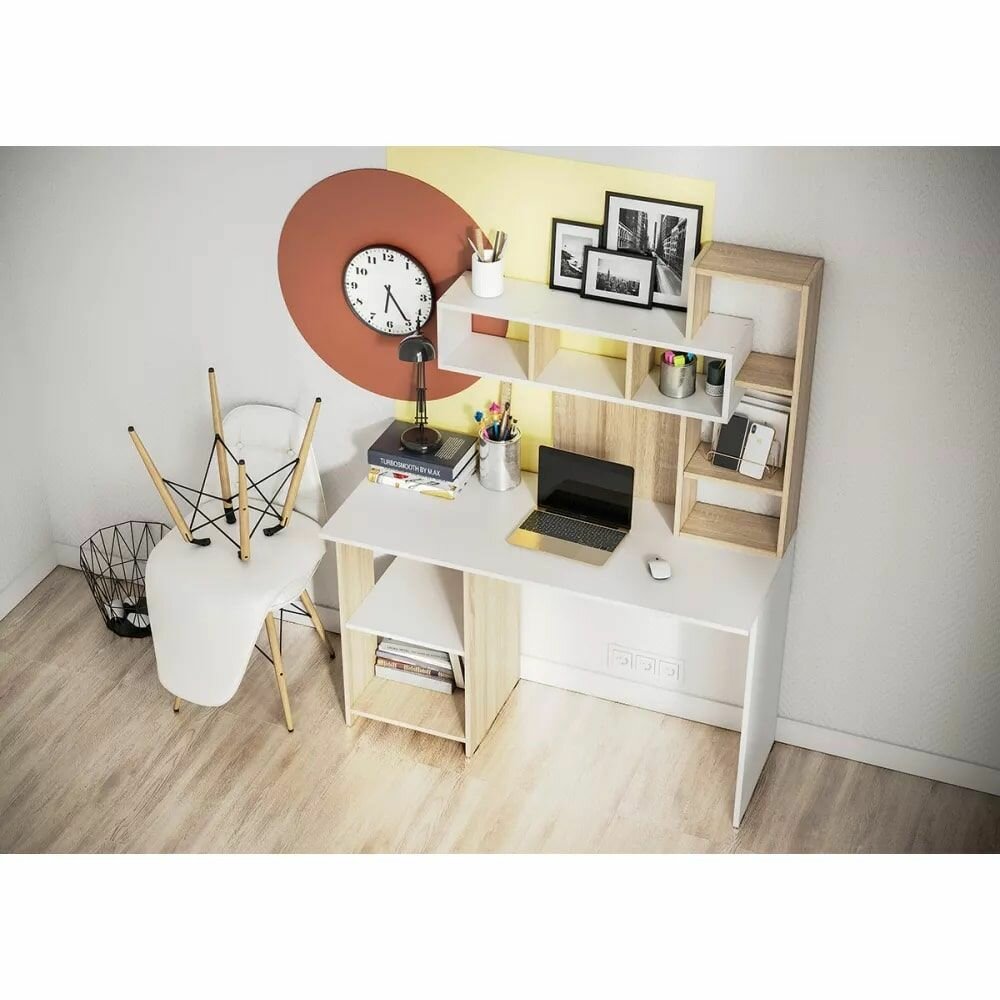 10 цен на Стол компьютерный Олимп Белый/Дуб сонома ЛДСП с полками, для гостиной, спальни, подростка 1200х500х1550 интерьер-центр