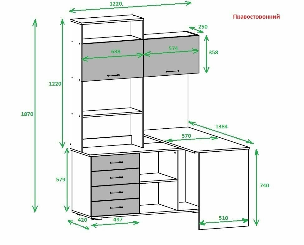 Дополнительная информация | Размеры:Высота: 1870 ммШирина: 1384 ммГлубина: 570 ммОсобенности:Надёжные и практичные шариковые направляющие полного выдвиженияГазлифты в антресолях с открыванием вверхРабочая зона стола: 1384*1220 мм по ширине, 570*440 мм по глубине и 550 мм по высоте.Применяемые материалы: корпус ЛДСП, фасад ЛДСП. |