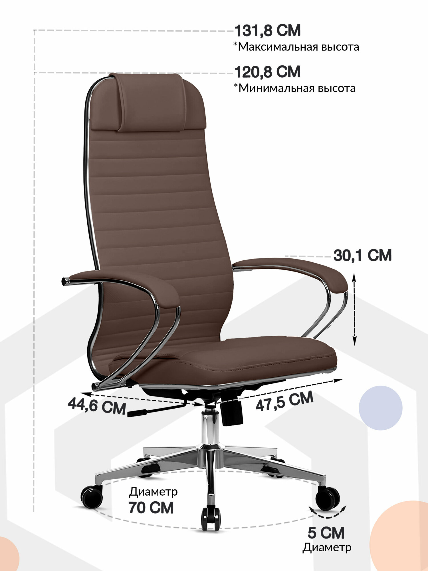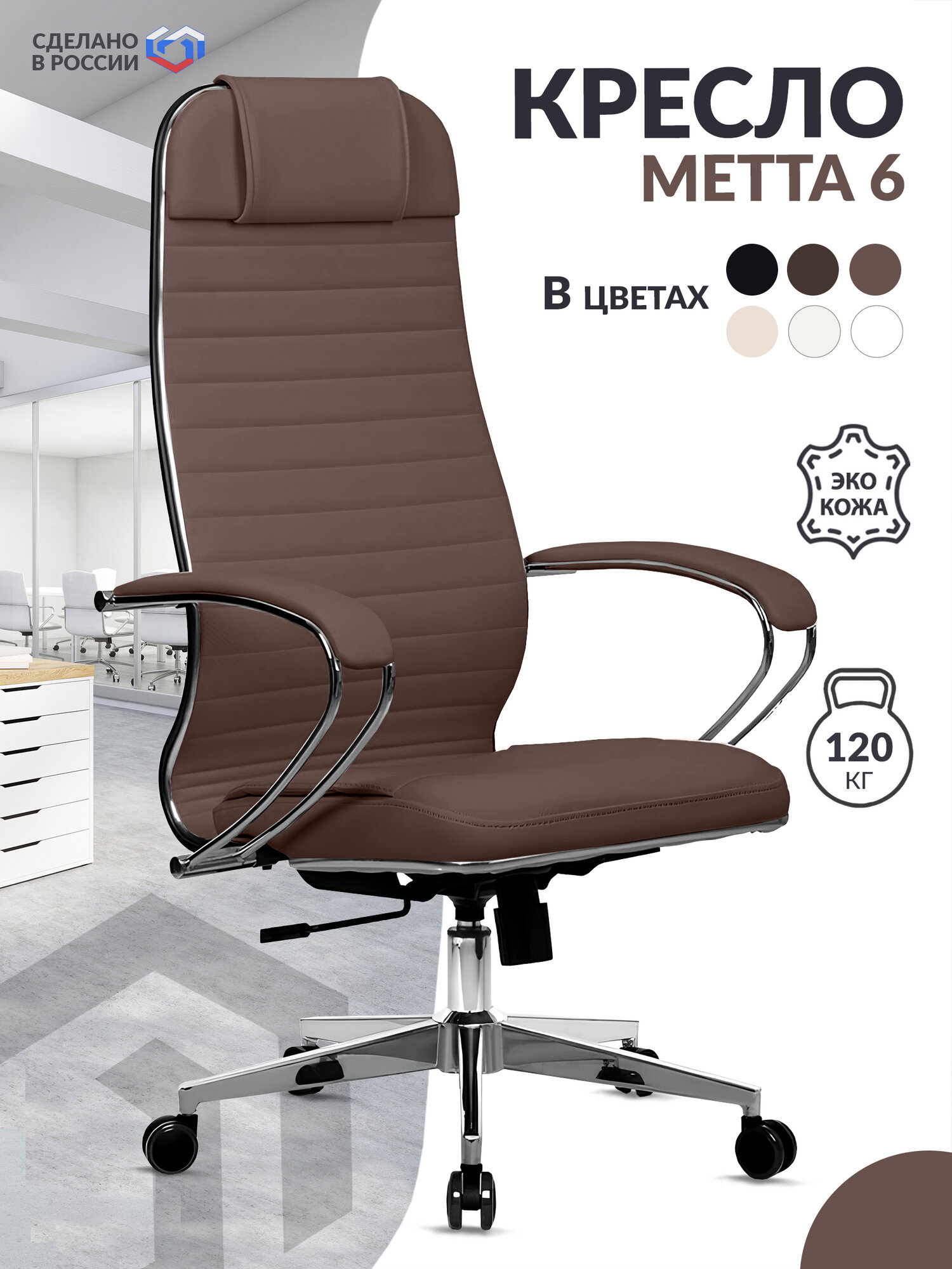 Кресло компьютерное Метта 6-2 на колесиках, с подлокотниками, высокой спинкой, подголовником, экокожа, коричневое / Стул ортопедический, 120 кг 28 346 ₽