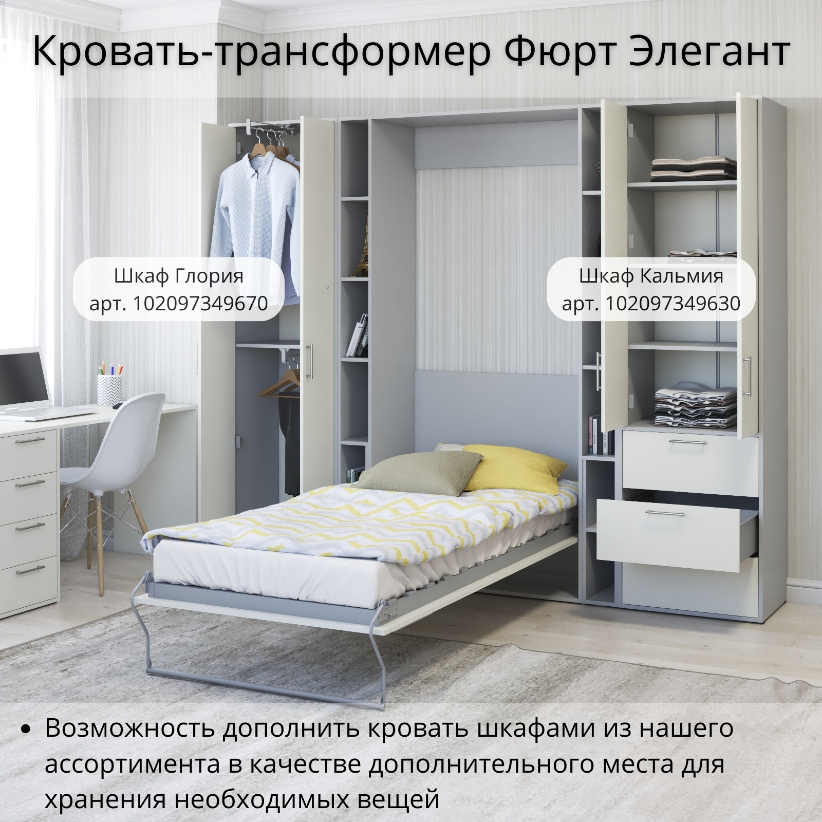 Шкаф кровать трансформер с креплением к стене, Stylint, Фюрт Элегант, 90х200, Серый шагрень/Белый платиновый информация: