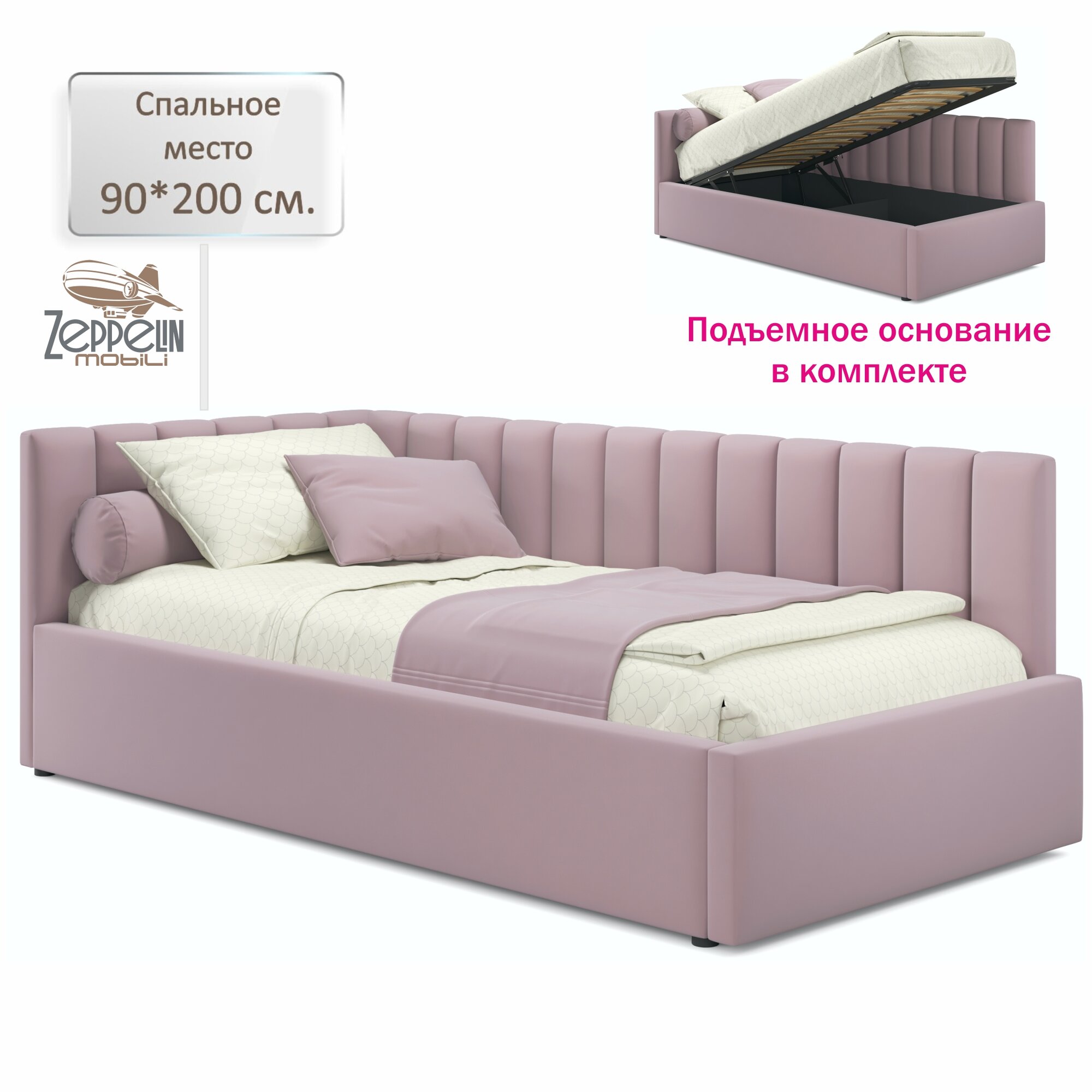 Кровать-тахта Milena 90х200 односпальная лиловая подъемная, мягкая спинка из велюра, с ортопедическими ламелями, с ящиком для хранения информация:
