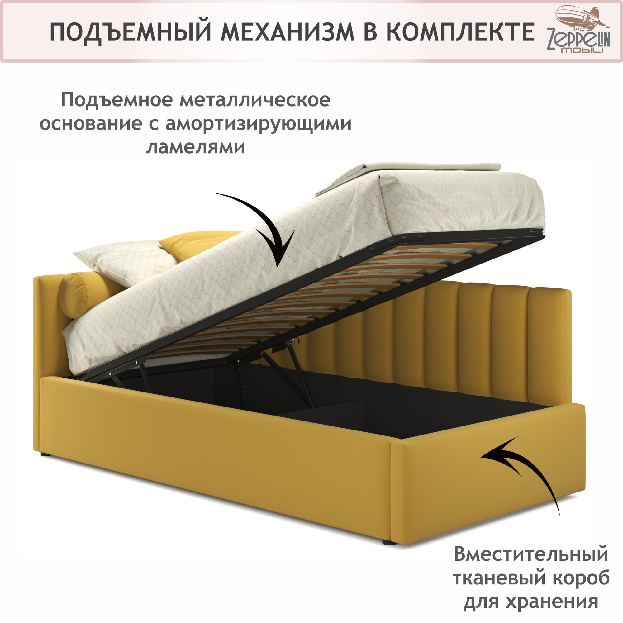 Кровать-тахта Milena 90х200 односпальная желтая подъемная, мягкая спинка из велюра, с ортопедическими ламелями, с ящиком для хранения информация: