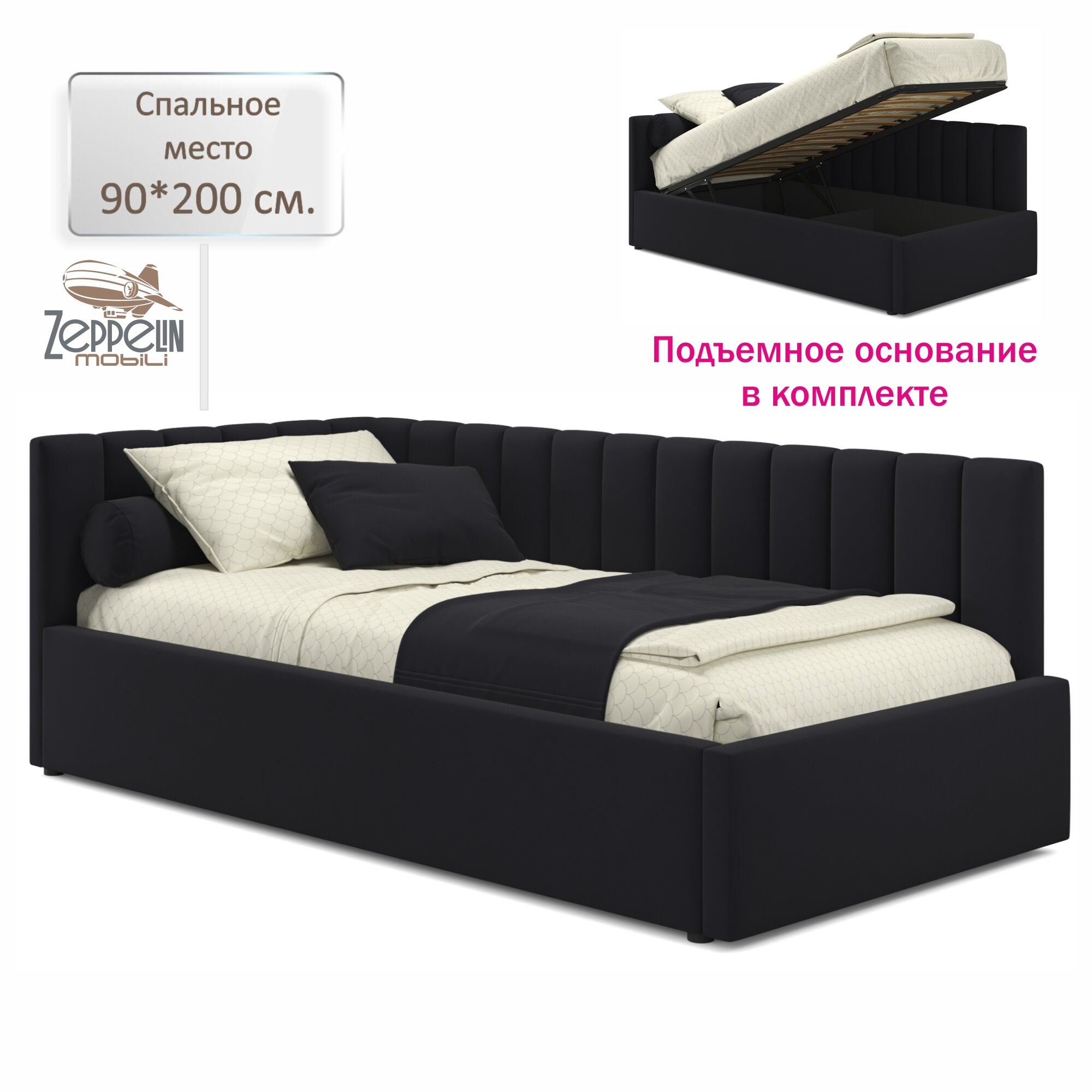 Кровать-тахта Milena 90х200 односпальная темная подъемная, мягкая спинка из велюра, с ортопедическими ламелями, с ящиком для хранения информация: