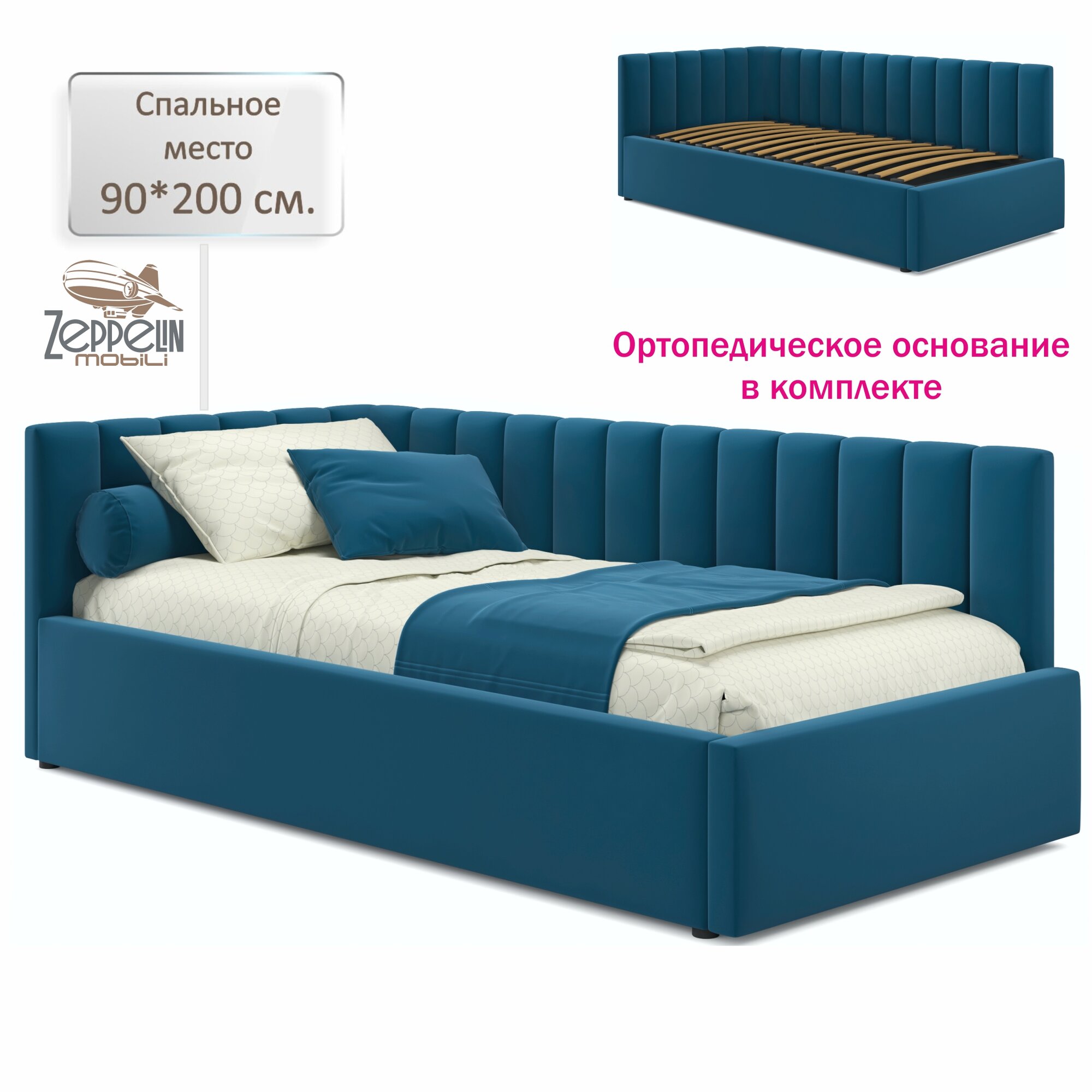 Кровать-тахта Milena 90х200 односпальная синяя, мягкая спинка из велюра, с ортопедическими ламелями информация: