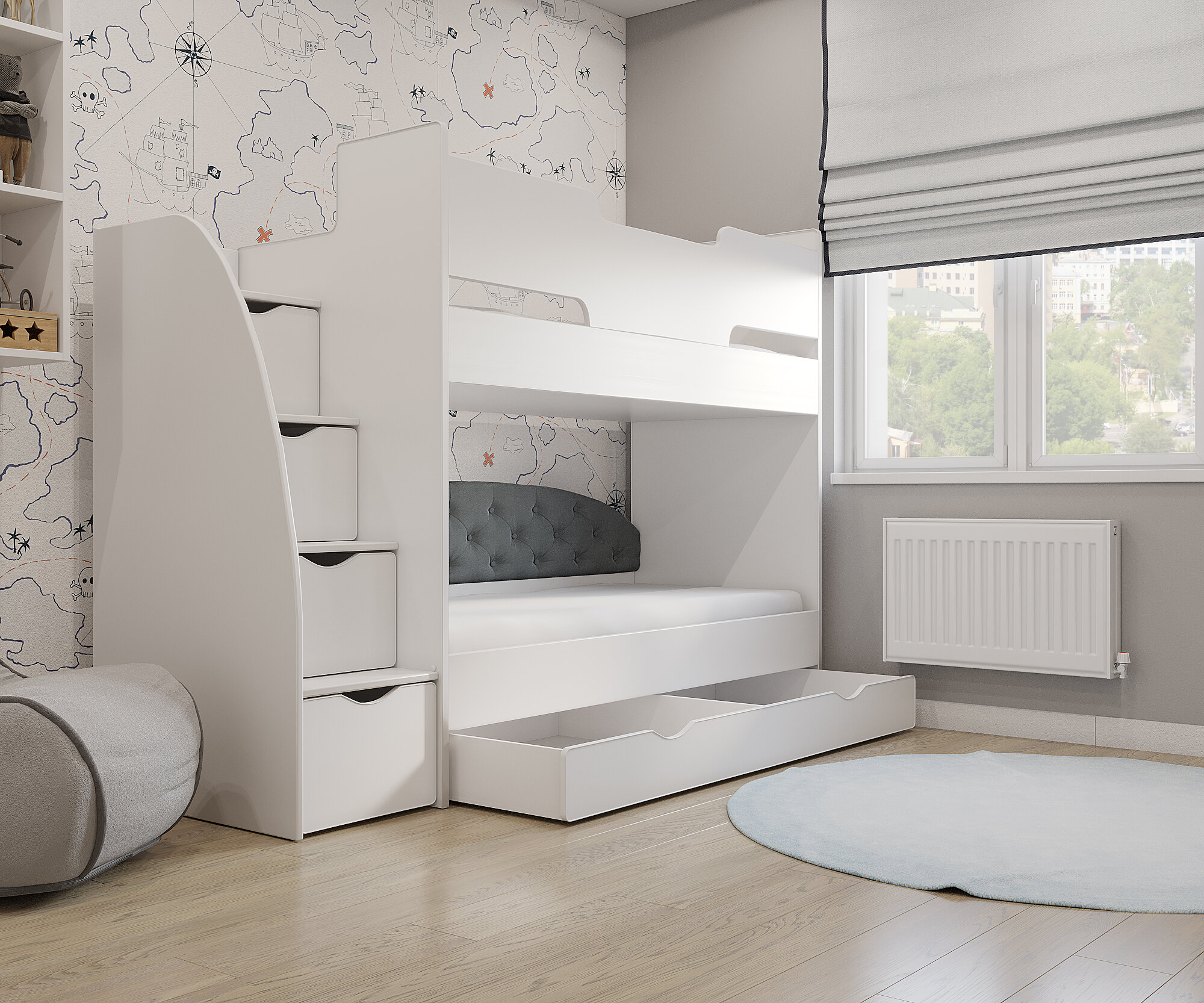 Matrix кровать детская двухъярусная с мягкой спинкой "Junior 13" лестница справа