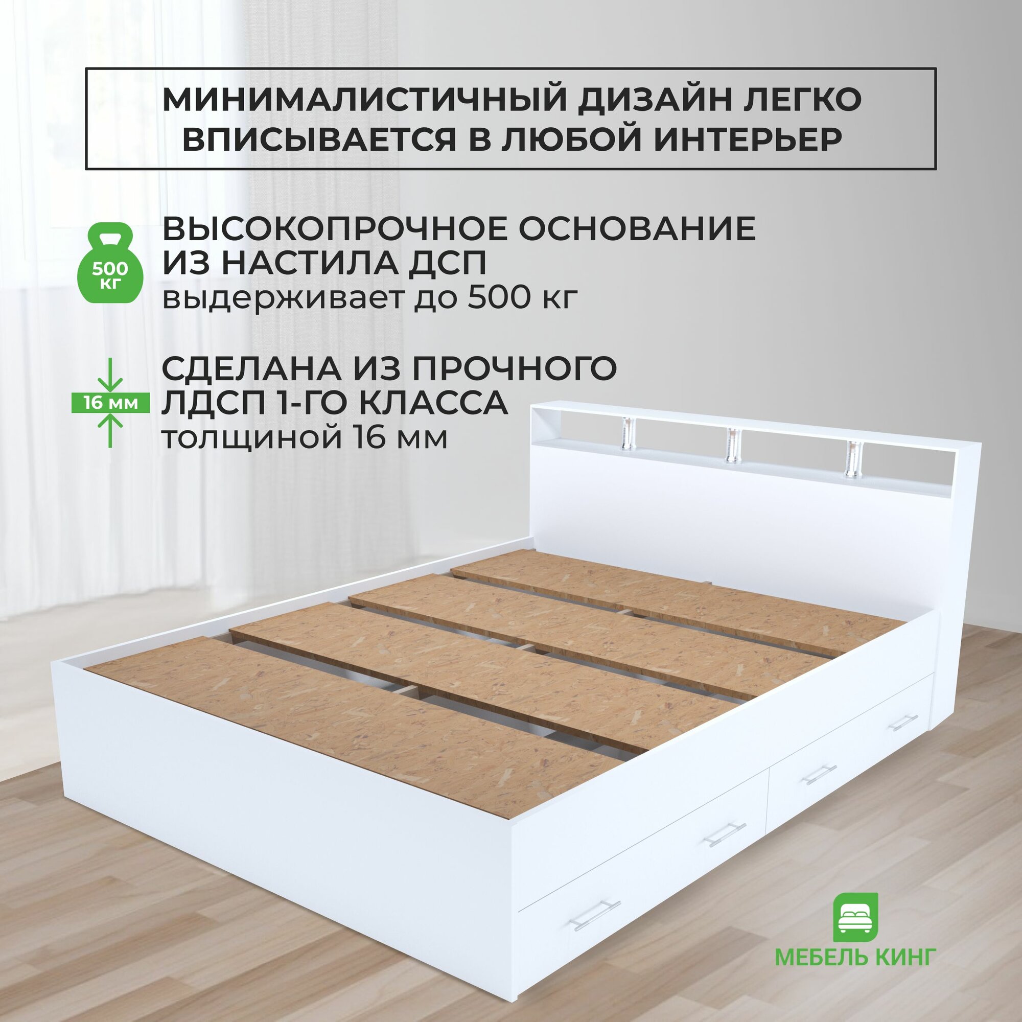 Двуспальная кровать с усиленным ДСП основанием Саломея с ящиками 140х200, белая, Мебель Кинг 13 850 ₽