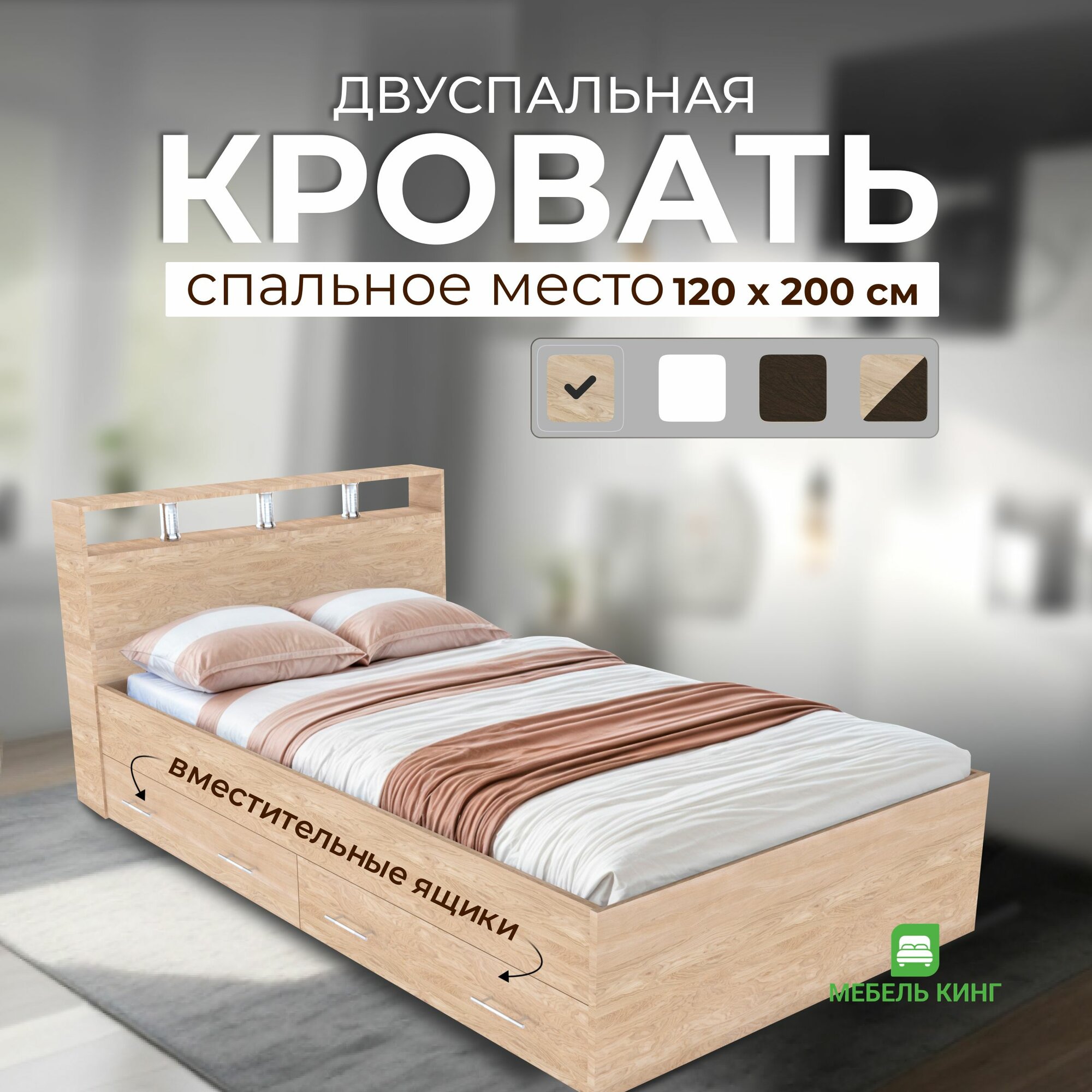 10 цен на Двуспальная кровать Саломея с ящиками 120х200, дуб сонома, Мебель Кинг