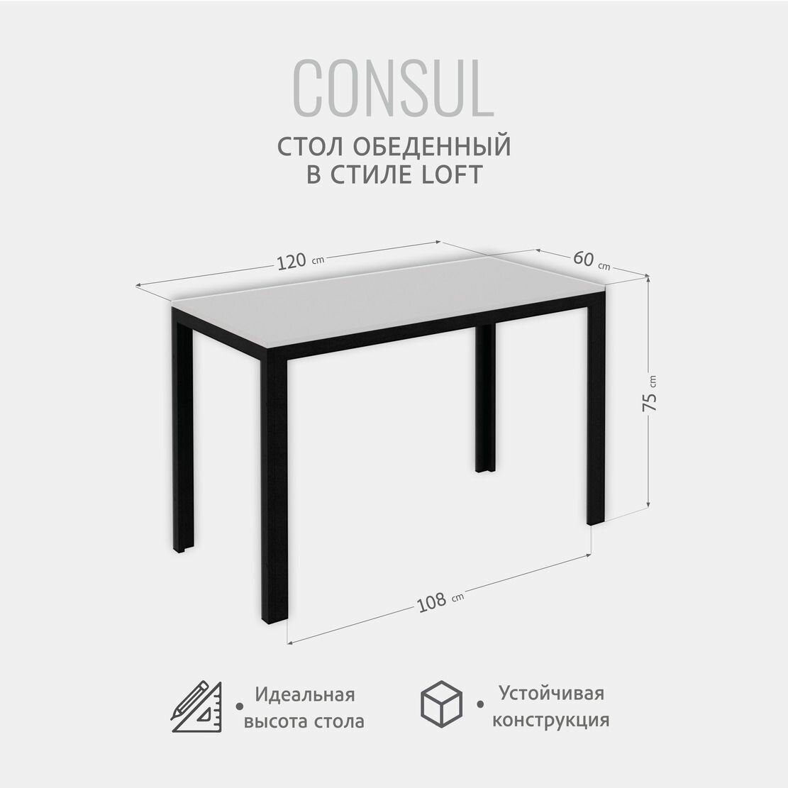 Стол кухонный CONSUL, белый, обеденный стол лофт, 120х60х75 см, гростат информация: