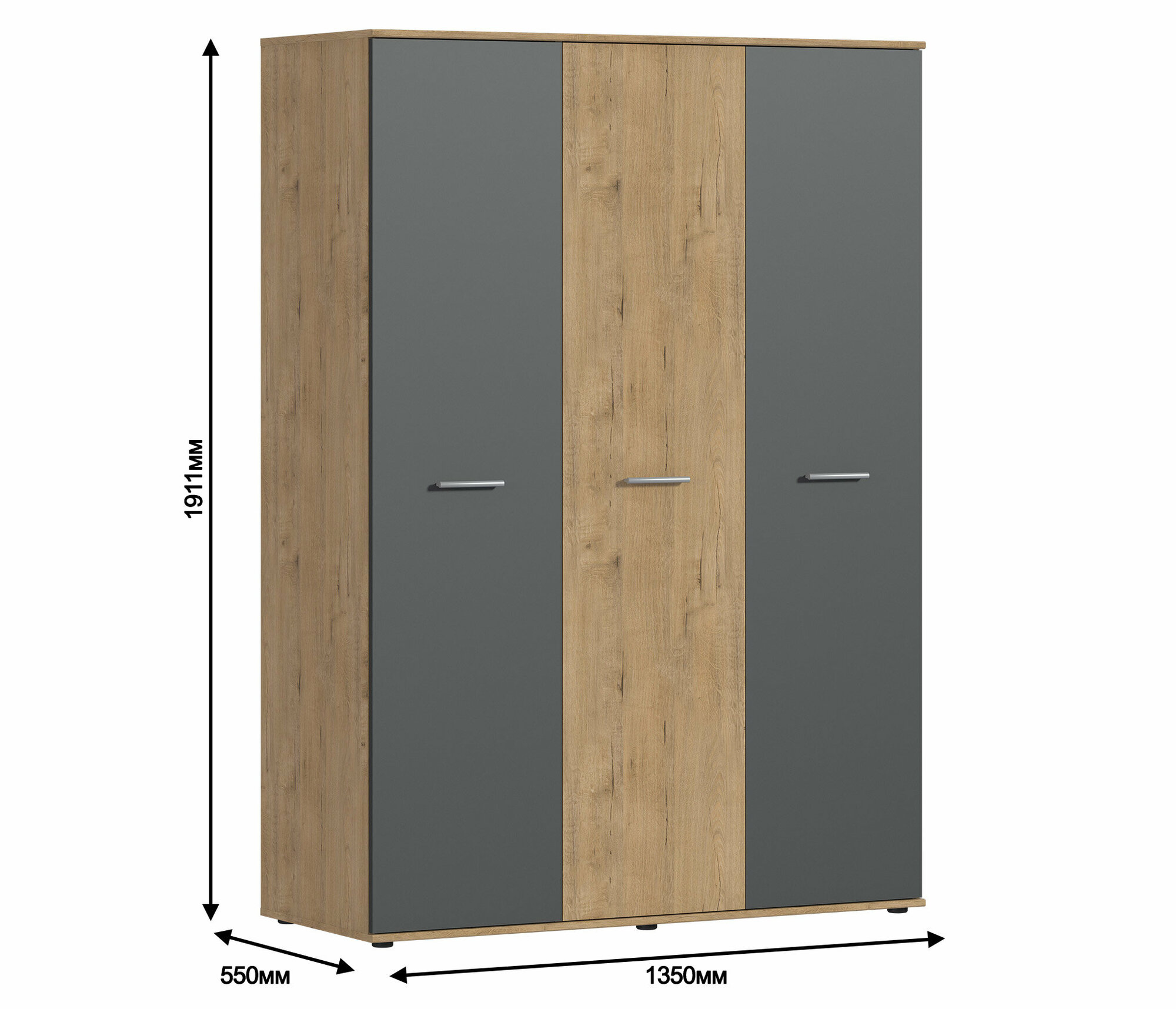 Трехдверный шкаф столплит Мамбо СБ-2676 со штангой, с 6 полками, Дуб Бунратти/Дуб Бунратти, Диамант серый 135х191х55 см информация: