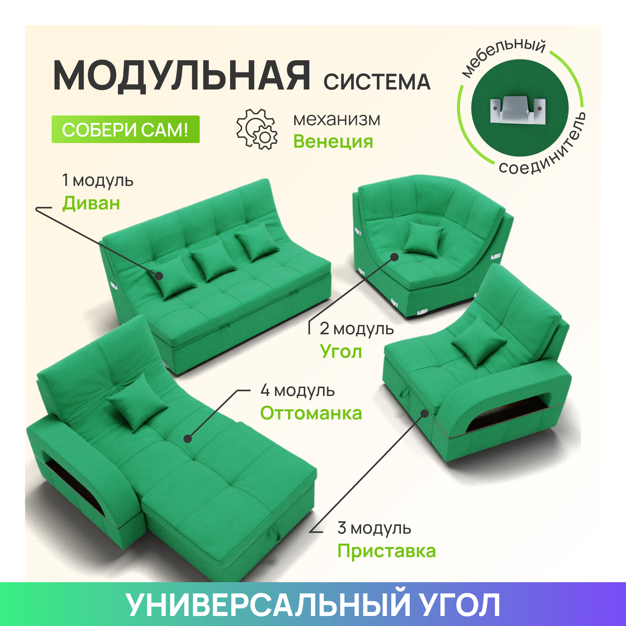 Модульный диван, Майами-4 ,Велютта люкс 42 премиум класса YORCOM,350x135x97,Светло-зеленый. Велюр,ППУ,ДВП,Дерево,механизм Венеция. информация: