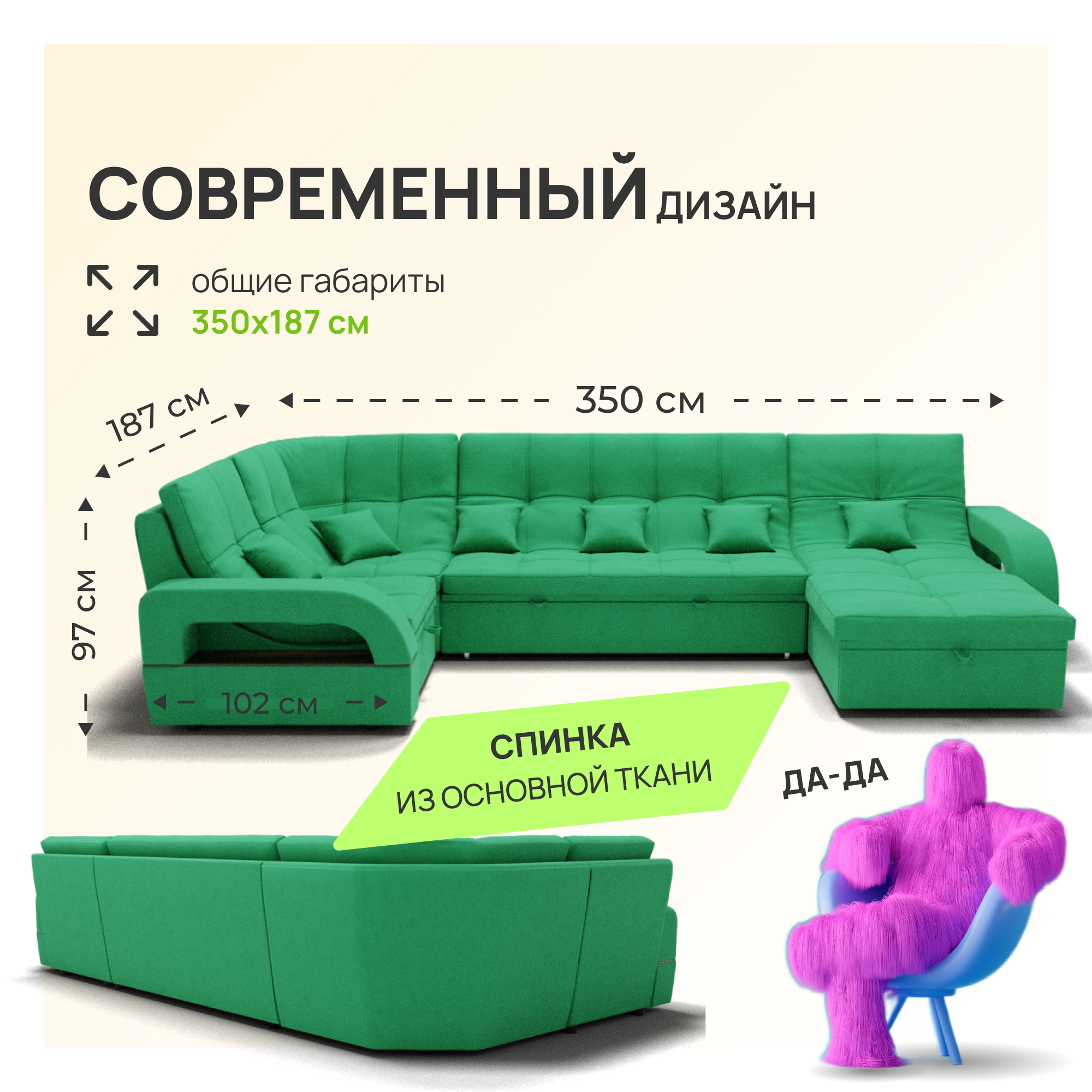 Отзывы на Модульный диван, Майами-4 ,Велютта люкс 42 премиум класса YORCOM,350x135x97,Светло-зеленый. Велюр,ППУ,ДВП,Дерево,механизм Венеция.