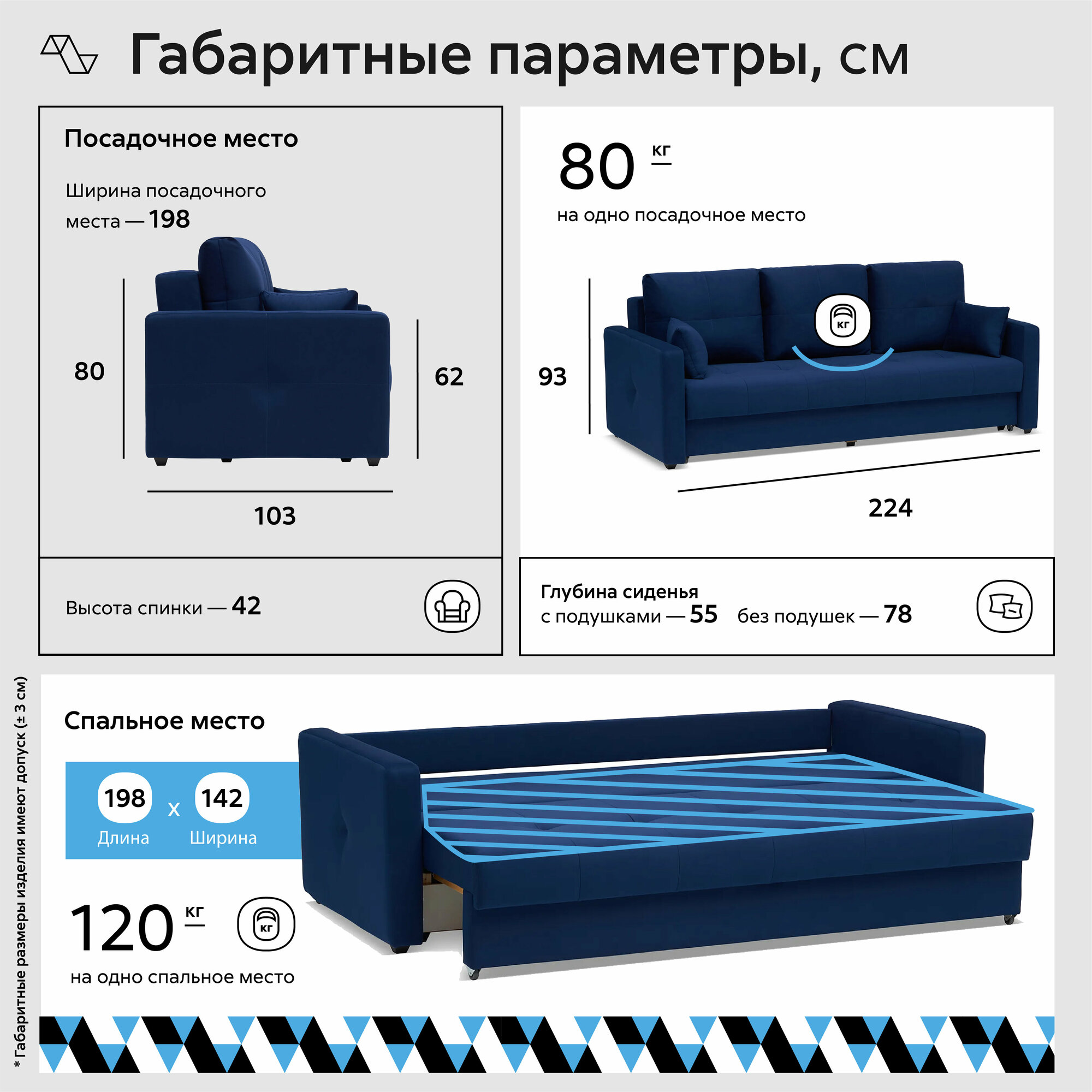 Диван прямой Mebior Tech Вита с независимым пружинным блоком темно-синий 222х103х93 см информация: