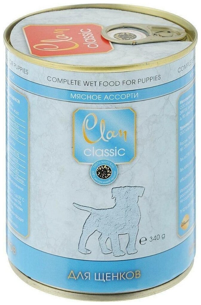 Корм полнорационный консервированный Clan CLASSIC для щенков, Мясное ассорти, 340г, 12 шт.