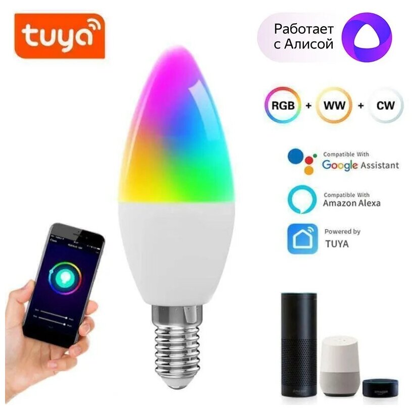 Умная лампочка AOAT RGB с Wi-Fi, Яндекс Алисой, Google Home, Smart Bulb 5W E14 информация: