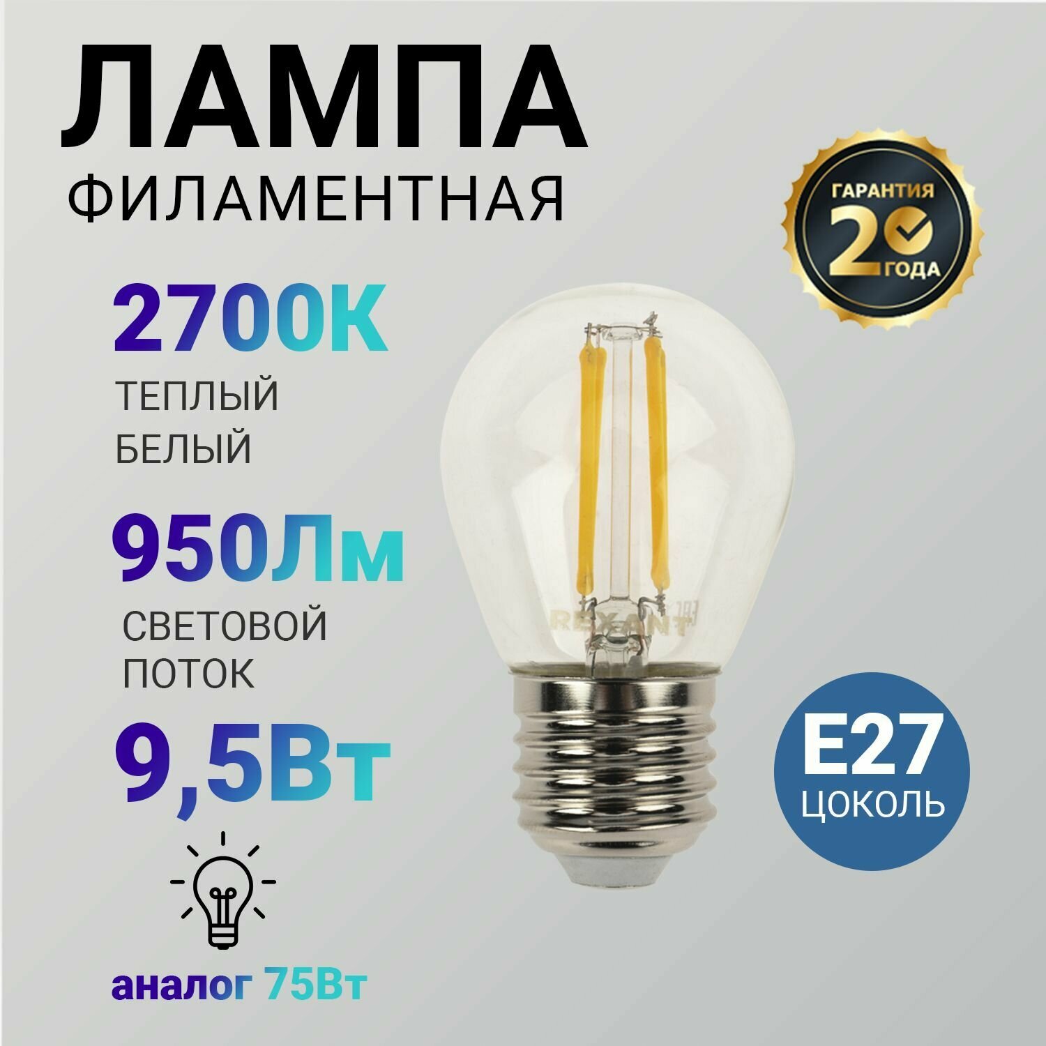 Лампочка филаментная REXANT Шарик GL45 9.5 Вт 950 Лм 2700K E27 прозрачная колба информация: