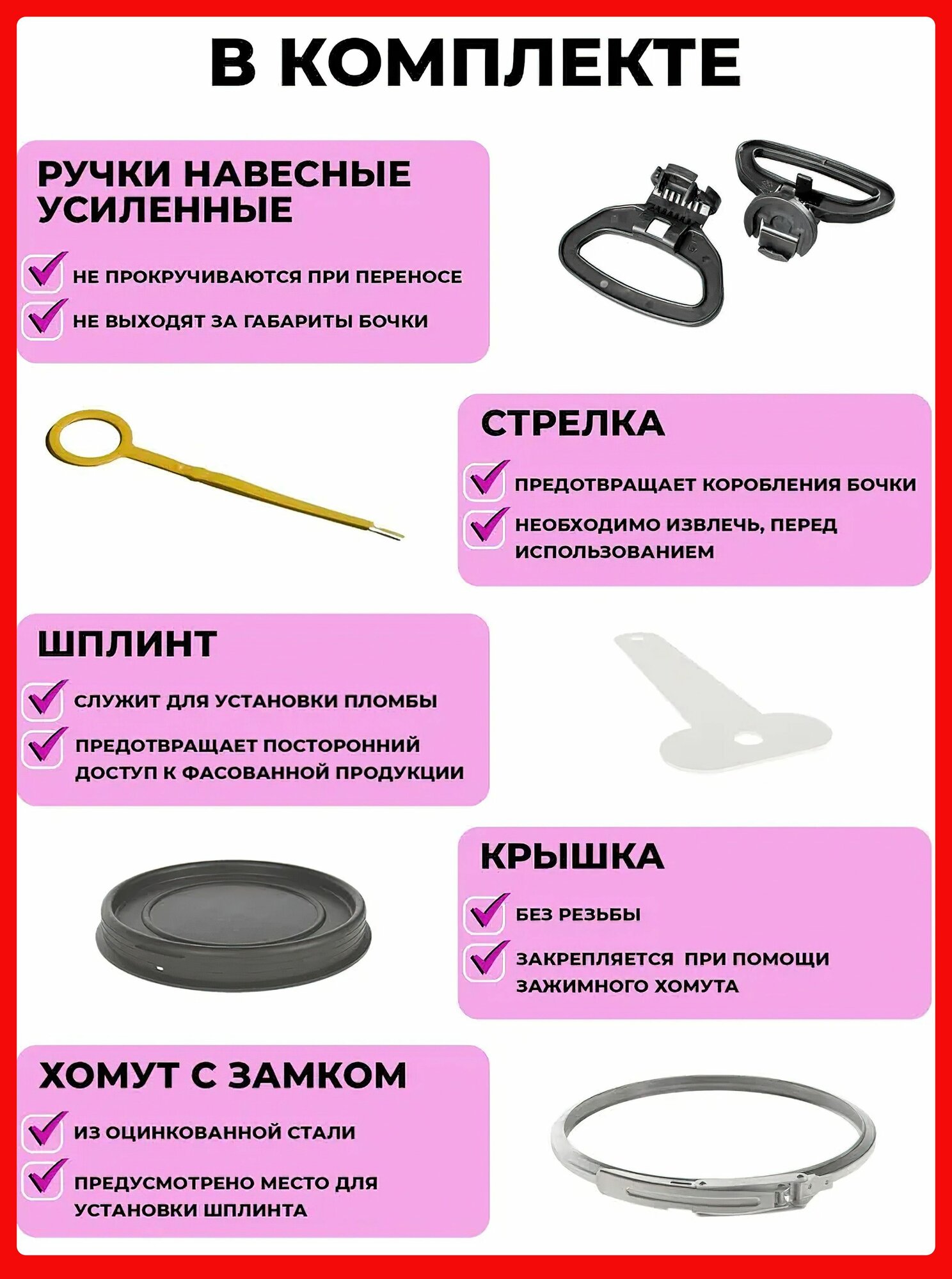 | Комплектация | Бочка пластмассовая - 1 шт., Ручка пластмассовая - 2 шт., Уплотнительный жгут - 1 шт., Крышка пластмассовая - 1 шт., Обруч металлический- 1 шт., Шплинт-фиксатор - 1 шт. |