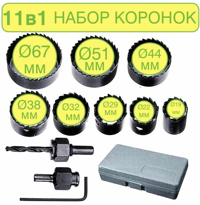 10 цен на 11 в 1 Набор коронок по дереву 11 предметов D19-67мм (19, 22, 29, 32, 38, 44, 51, 67мм)Кольцевая пила/Пильные венцы по дереву
