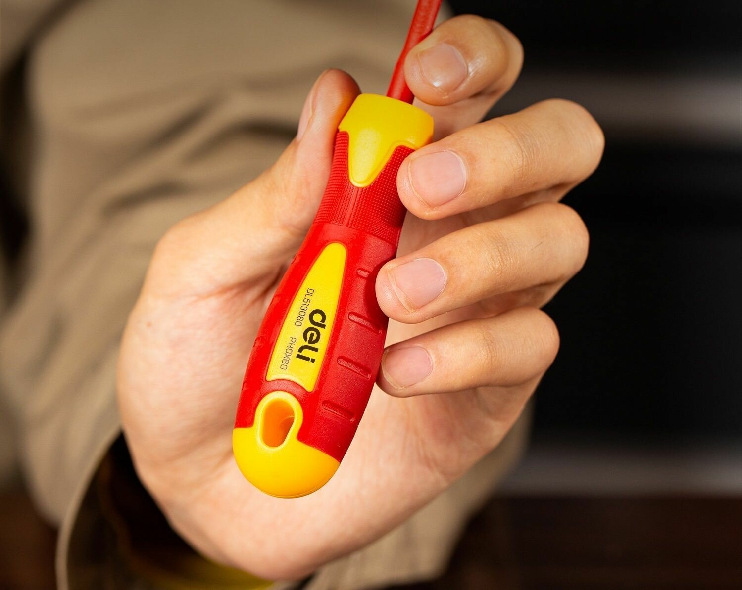 10 цен на Диэлектрическая крестовая отвертка Deli DL513060 PH0x60 (сертификат vde до 1000в, магнитный наконечник, сталь cr-v, рукоять pp+tpr)