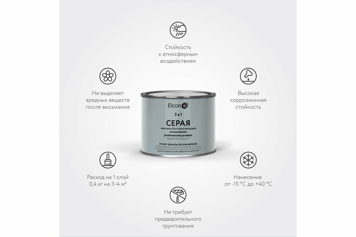 Elcon Быстросохнущая грунт-эмаль 3 в 1 по ржавчине/ краска по металлу серая 0,4 кг 00-00462646 информация: