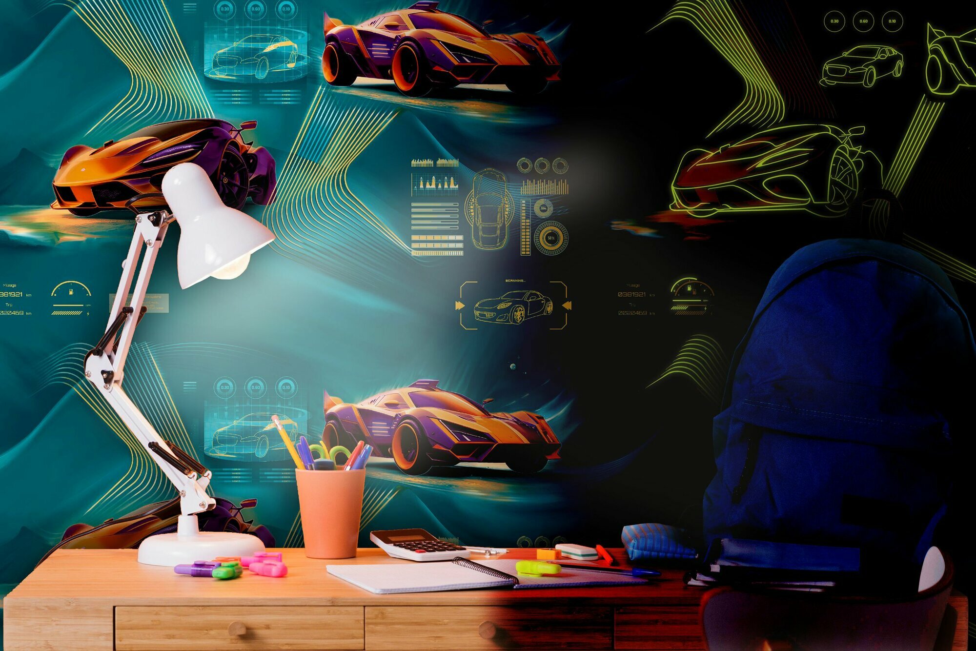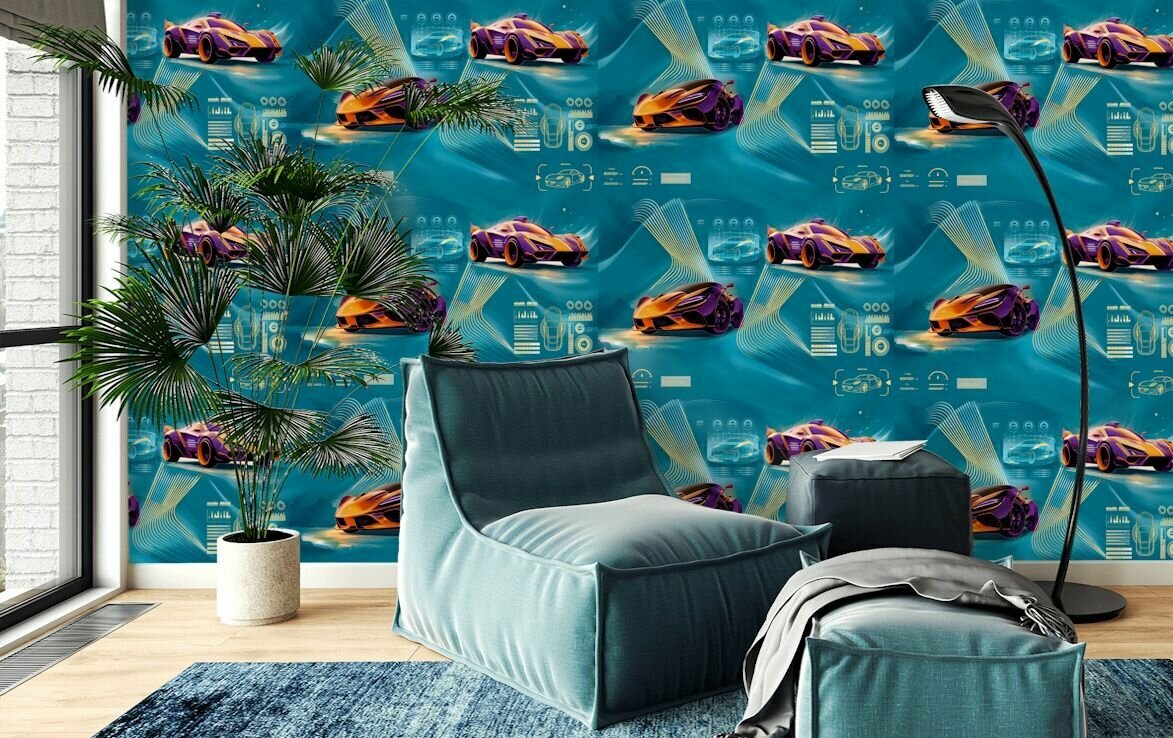 Обои виниловые в подростковую комнату с машинами104 УФ-свечение 1,06*10м метровые для мальчика бирюзовые информация: