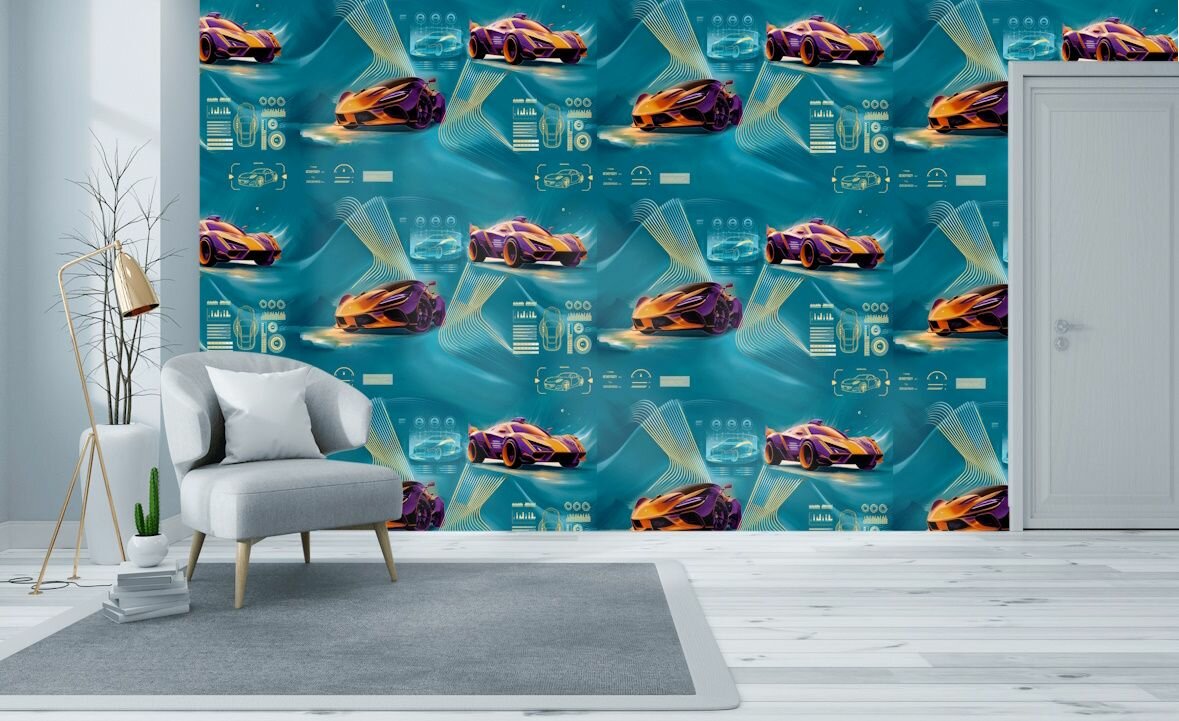 Обои в детскую комнату светящиеся гоночные машины105 фиолетовые 1,06*10м для мальчика в бар в клуб 3 150 ₽