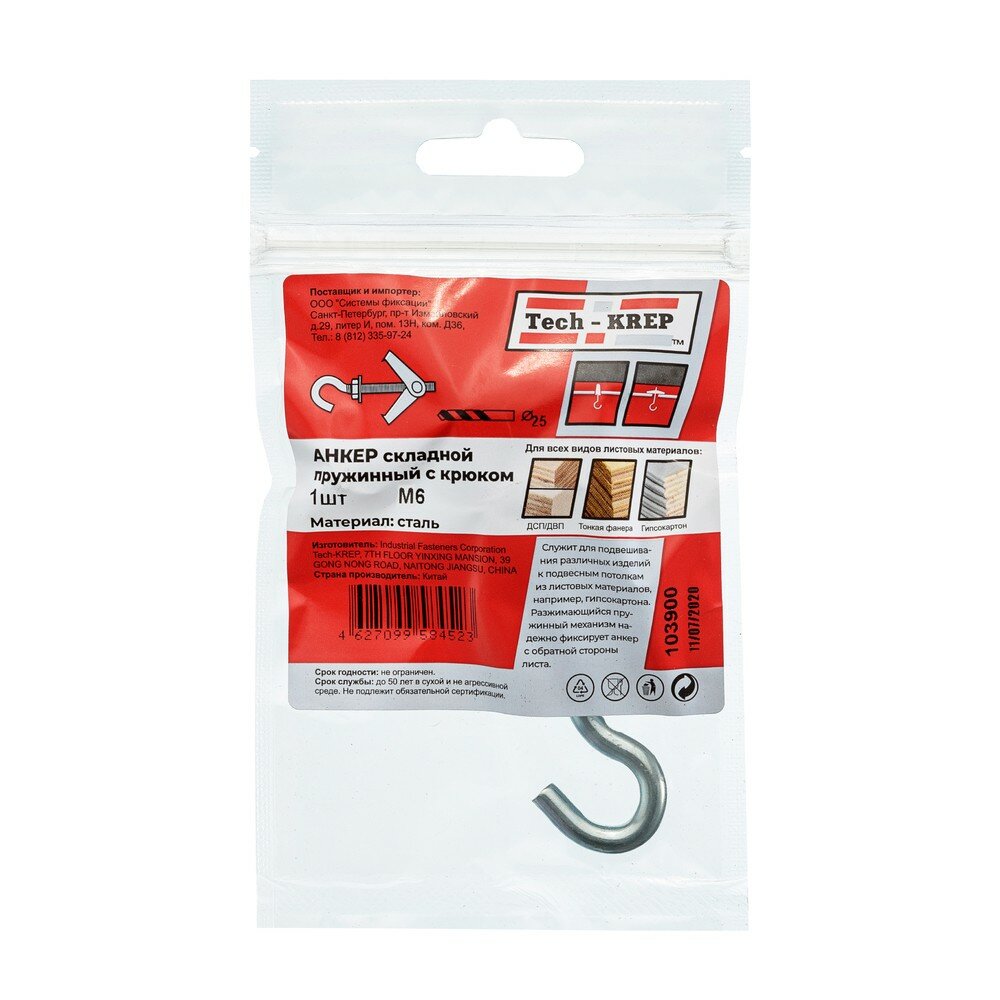 | Комплектация | Анкер складной пружинный с крюком М6 пакет Tech-Krep 103900 |