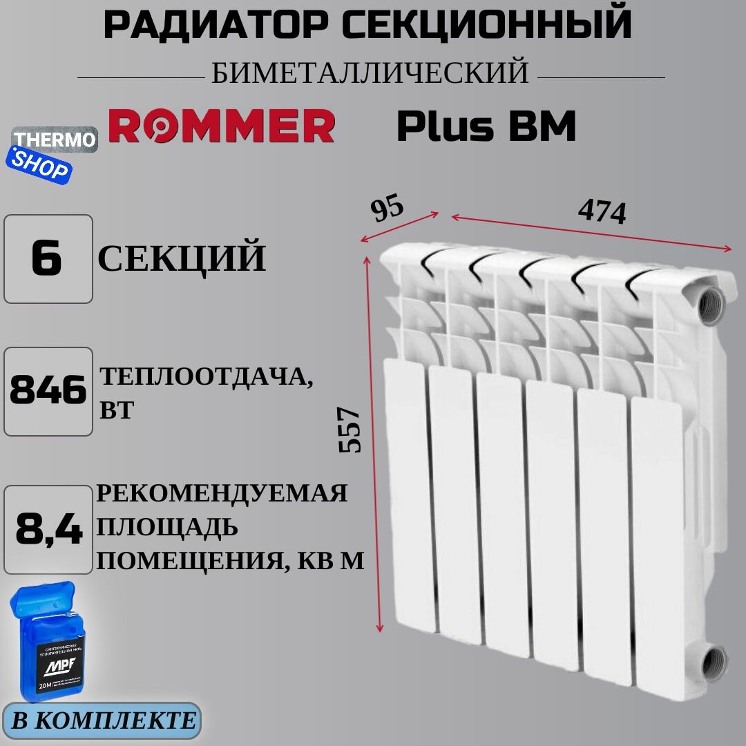 Радиатор секционный биметаллический Plus BM 500 6 секций параметры 557х474х95 боковое подключение Сантехническая нить 20 м информация: