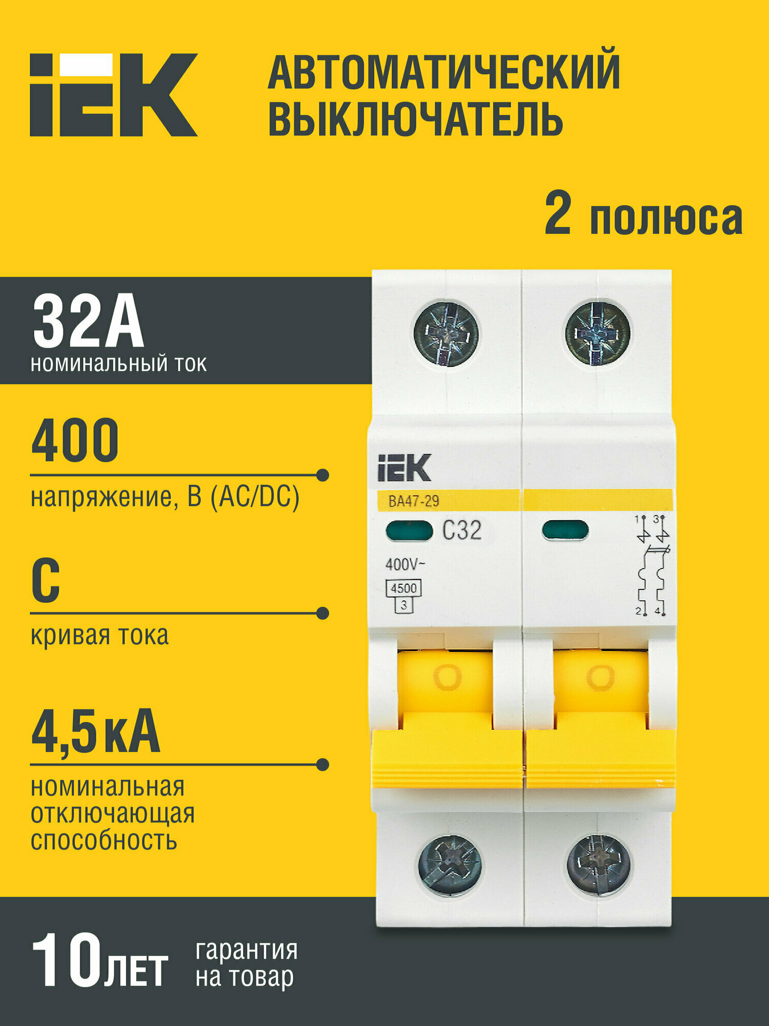 Автоматический выключатель IEK ВА 47-29 (C) 2P электромагнитный 4,5kA 32А информация: