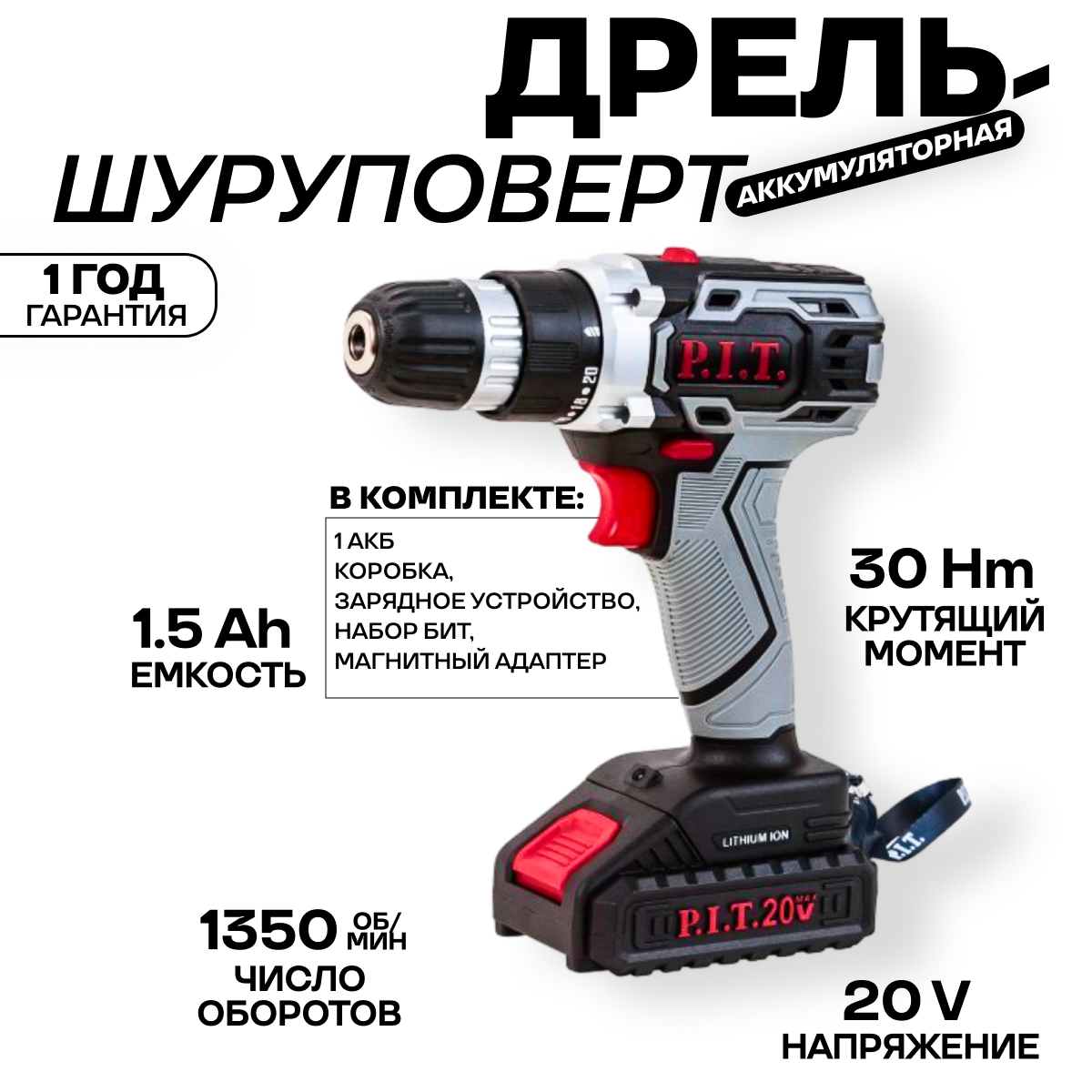 Аккумуляторная ударная дрель-шуруповерт P. I. T. PSB20H-13C электроинструмент, подарок на день рождения мужчине, любимому, папе, дедушке, парню