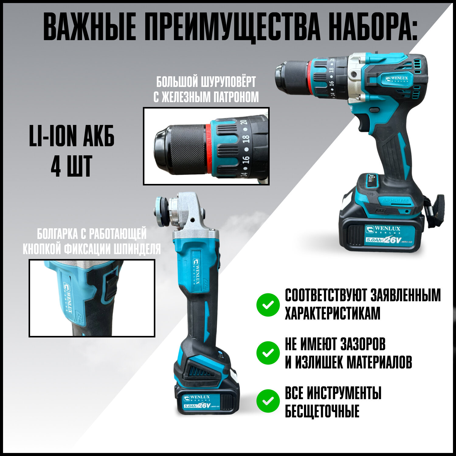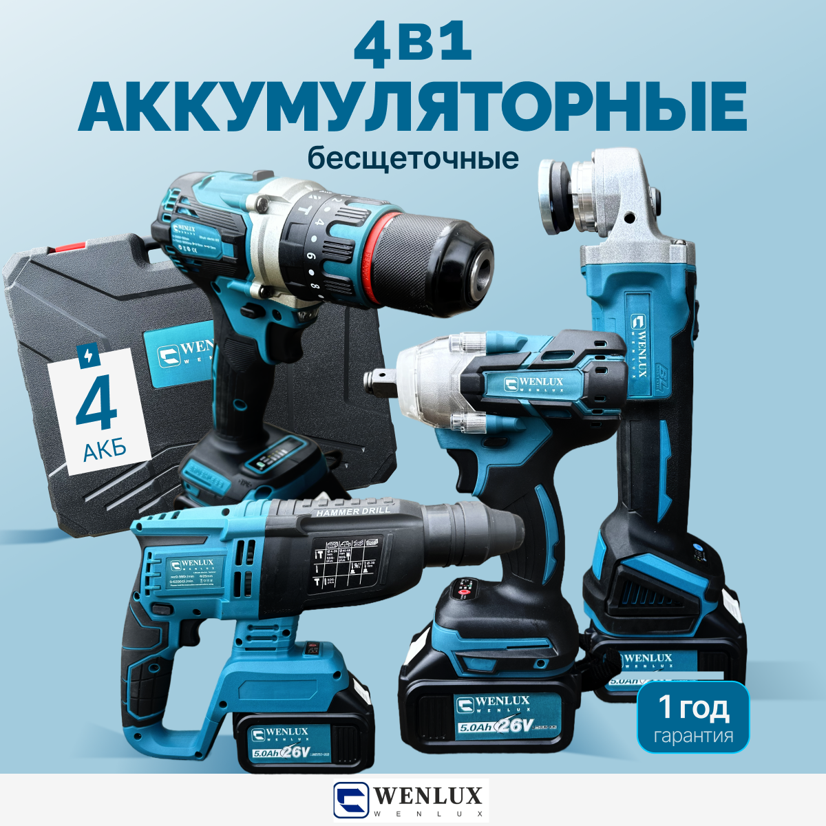 Отзывы на Набор электроинструментов 4в1 WENLUX / Шуруповерт, Гайковёрт, Перфоратор, Болгарка (ушм) / 4 аккумулятора
