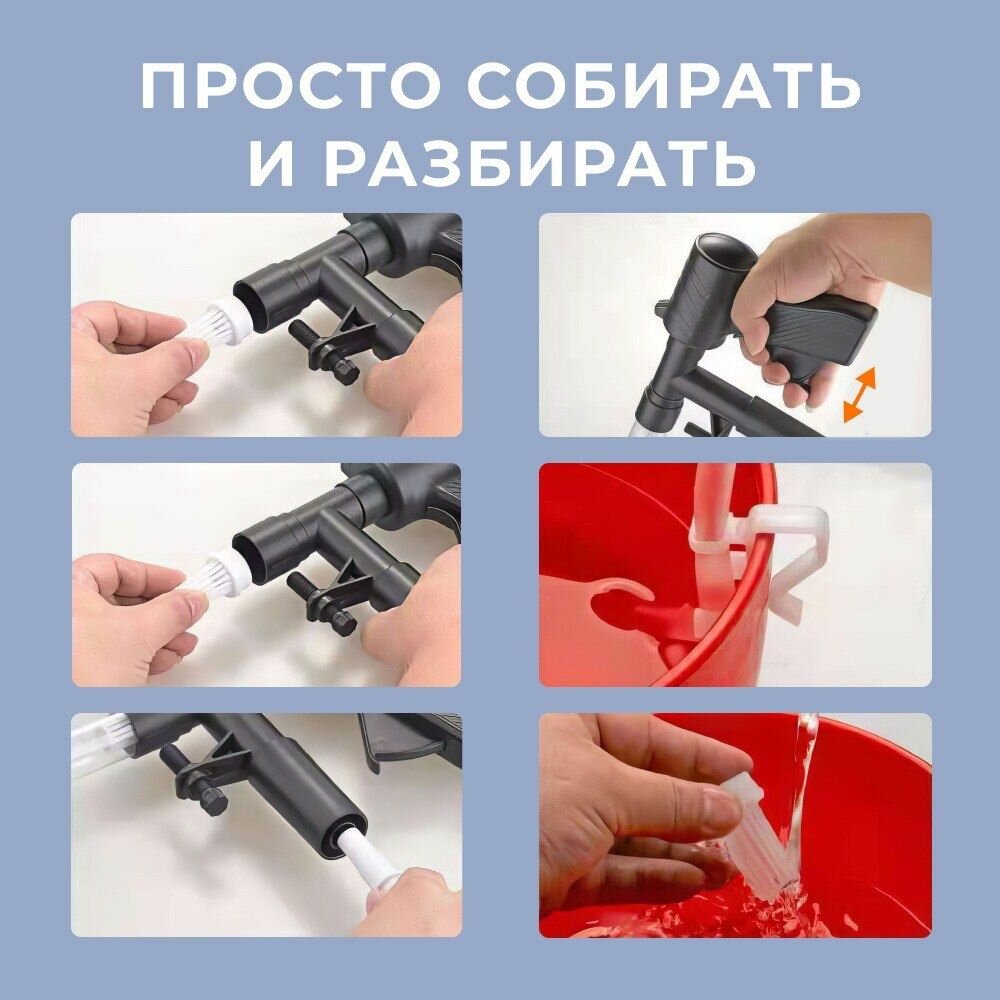 | Подробная комплектация | Кнопка нагнетания воздуха, сетка фильтра, шланг длинной 2м, крепеж на ведро, зажим для регулировки подачи воды, труба - 2 шт, муфта соединительная, муфта удлинительная, насадка-скребок для стекла |
