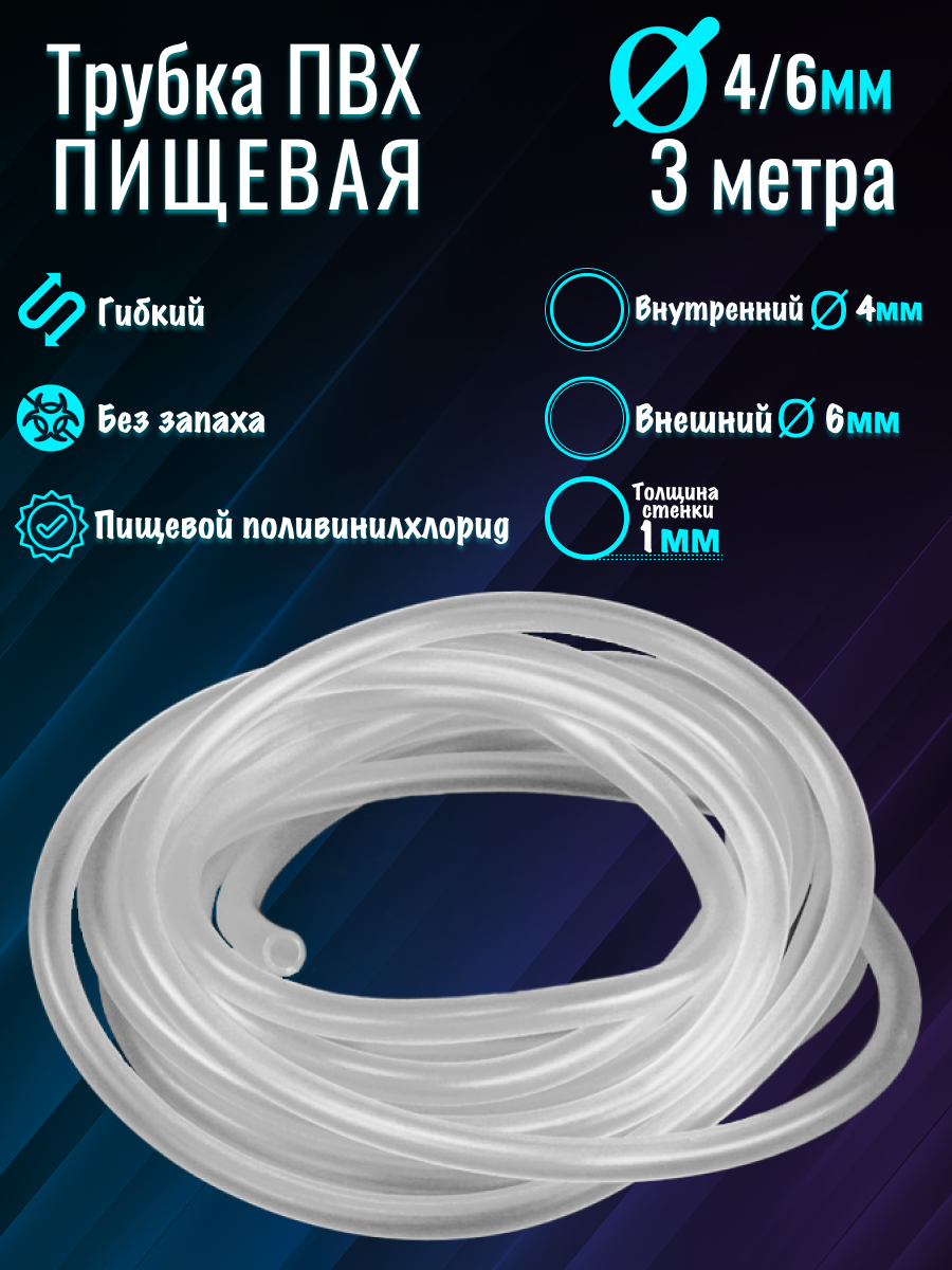 | Дополнительная информация | Материал: пищевой ПВХ; Внутренний диаметр: 4мм; Внешний диаметр: 6мм; Толщина стенки: 1мм |