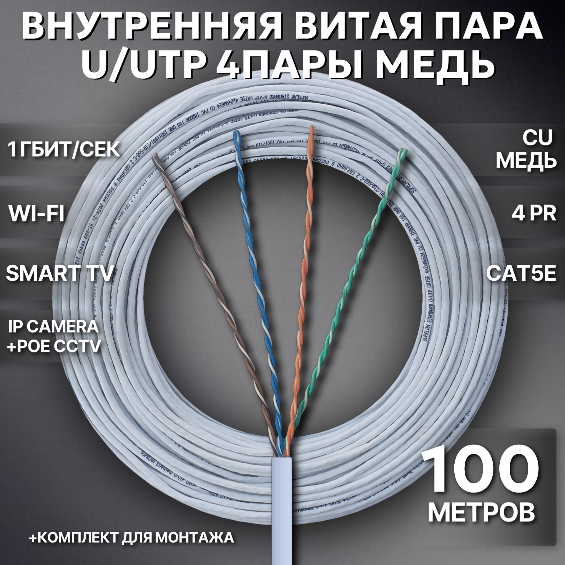 Внутренний интернет кабель. Витая пара UTP 4 пары, Cat.5е 24AWG Cu (Чистая бескислородная медь класса А) цвет: белый, 100 метров. информация:
